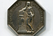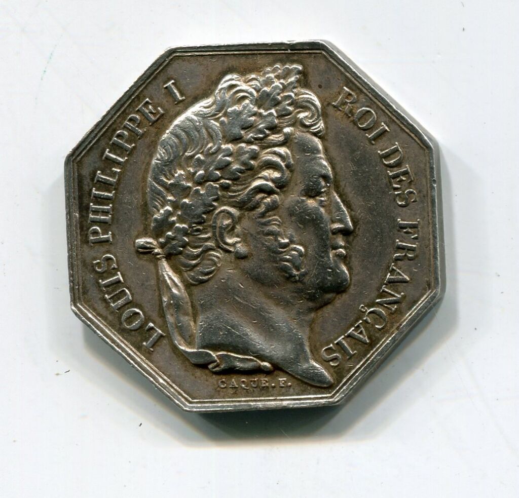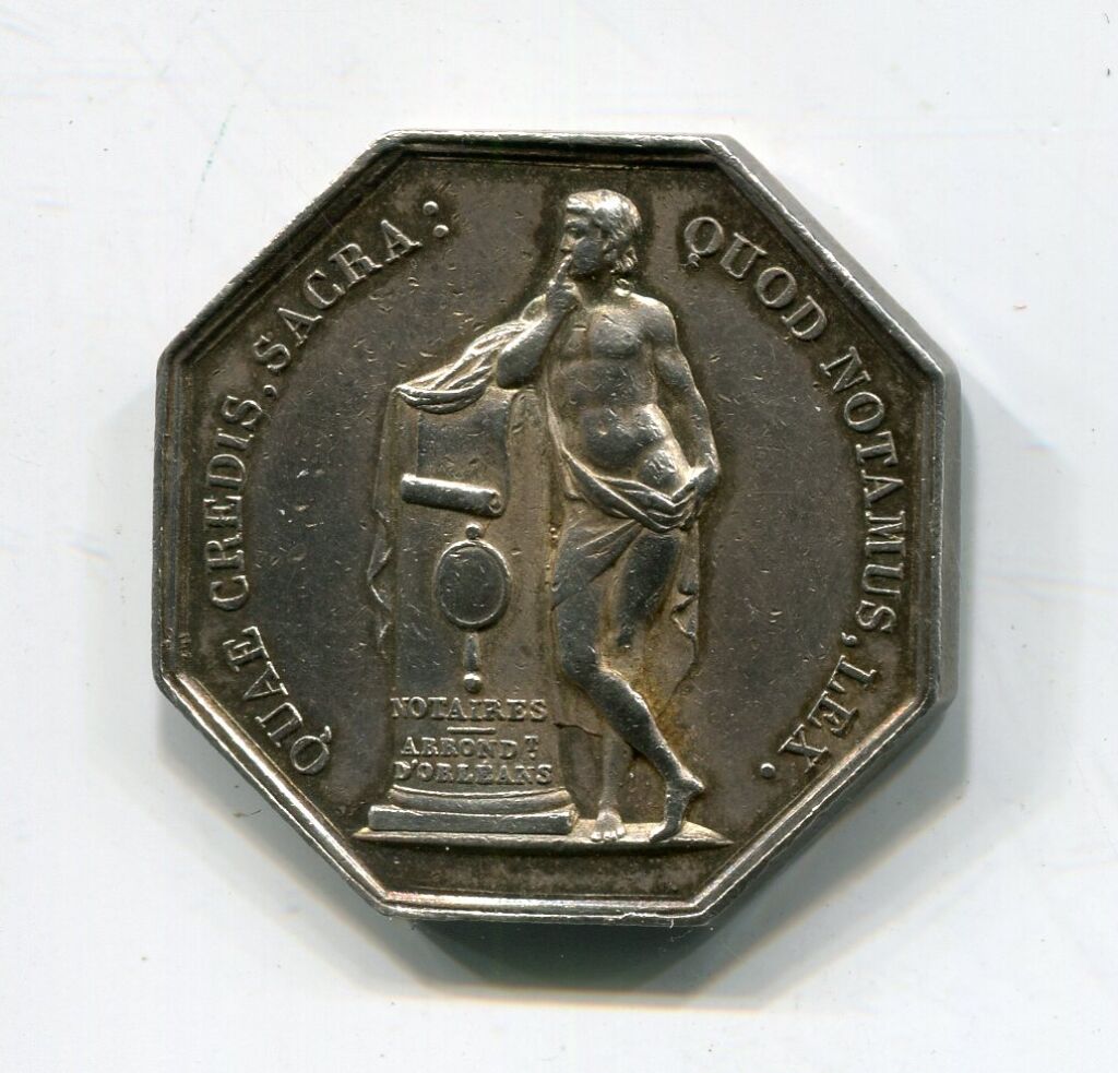 ARGENT - NOTAIRES D'ORLEANS - LOUIS PHILIPPE 1er ROI des FRANCAIS, buste GROSSE tête LAUREE profil à droite. Signature CAQUE sous le cou. - Revers : QUAE CREDIS, SACRA : QUOD NOTAMUS, LEX, jeune homme nu, les reins drapés, accoudé sur un cippe portant miroir de la prudence placé entre "Notaires" et " Arrondt d'orléans". Variante sans signature au revers - . jeton octogonal 30 mm, sur la tranche poinçons argent et proue de navire. - 16,07 grammes. - Lerouge n° 250 - L/A n° 1575 - TTB -