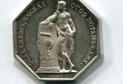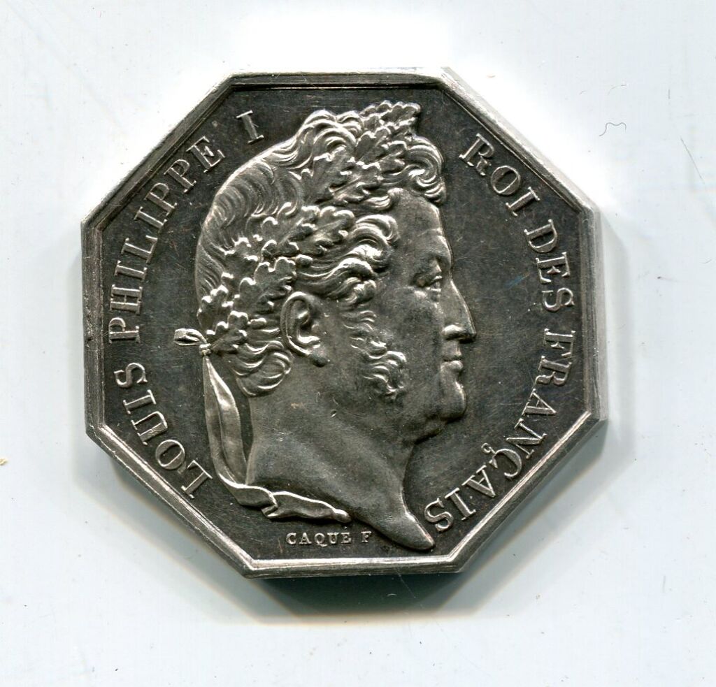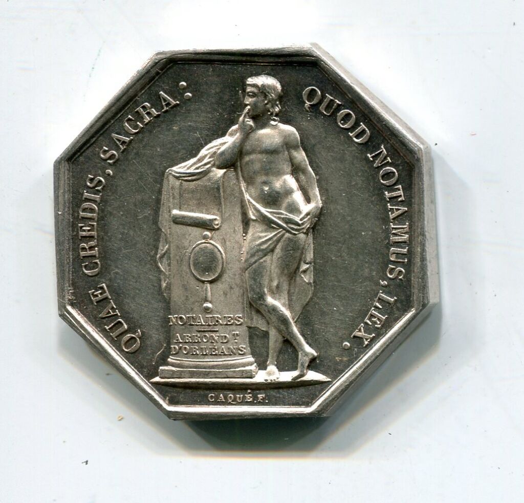 ARGENT - NOTAIRES D'ORLEANS - LOUIS PHILIPPE 1er ROI des FRANCAIS, buste GROSSE tête LAUREE profil à droite. Signature CAQUE sous le cou. - Revers : QUAE CREDIS, SACRA : QUOD NOTAMUS, LEX, jeune homme nu, les reins drapés, accoudé sur un cippe portant miroir de la prudence placé entre "Notaires" et " Arrondt d'orléans". signature caqué. jeton octogonal 30 mm, sur la tranche poinçon lampe antique.-