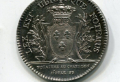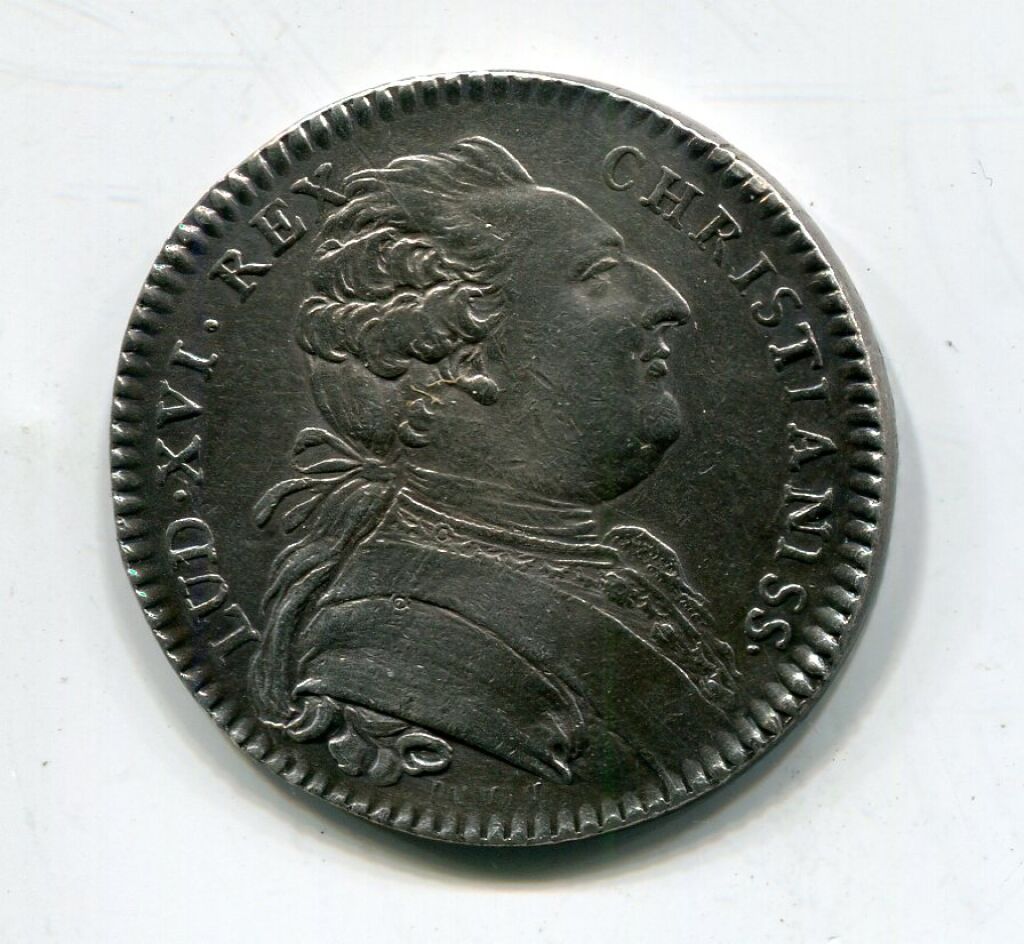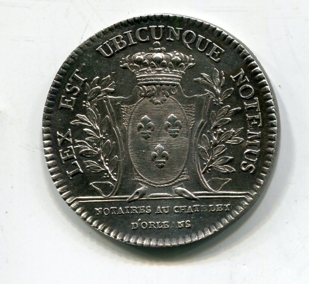 ARGENT - NOTAIRES D'ORLEANS - LOUIS XVI - " LUDOV . XVI . REX CHRISTIANISS", buste HABILLE du roi cheveux longs agrémenté en bas d'un ruban, profil à droite, signé DU VIV sous le col. - Revers : LEX EST UBICUNQUE NOTEMUS, armes de France couronnées et cantonnées de palmes - A l'exergue : " NOTAIRES AU CHATELET D'ORLEANS " -