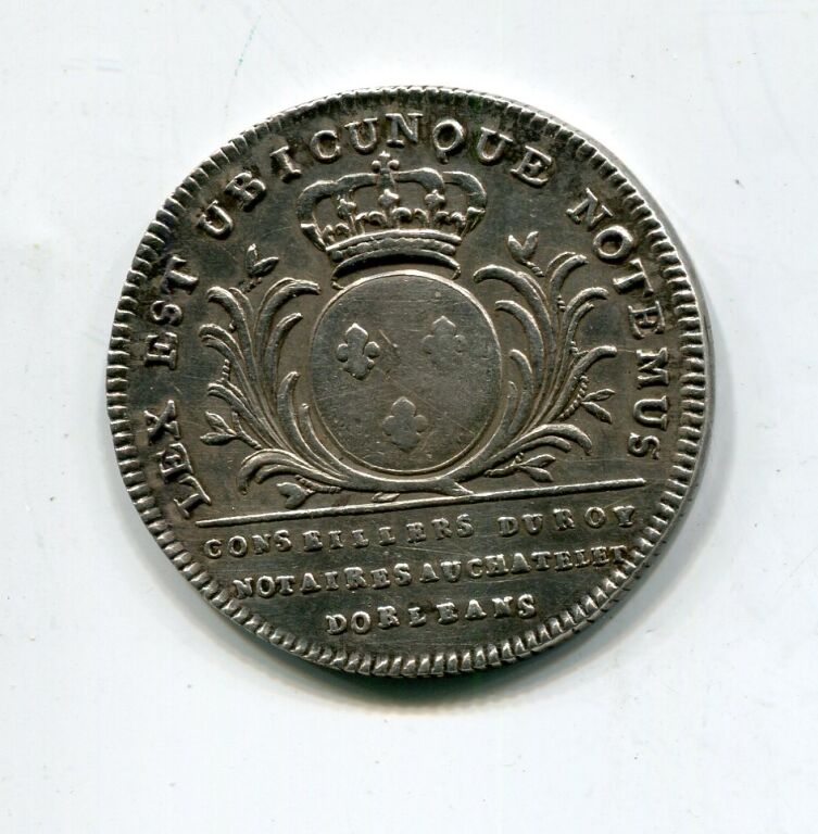 Revers : LEX EST UBICUNQUE NOTEMUS, armes de France couronnées et cantonnées de palmes - A l'exergue : " CONSEILLERS du ROY, NOTAIRES AU CHATELET D'ORLEANS " - RARE jeton ancien régime, rond 29 mm - 9,58 gr tranche cannelée -