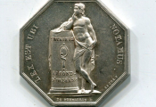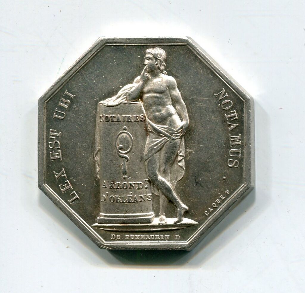 Revers : LEX EST UBI NOTAMUS, jeune homme nu, les reins drapés, accoudé sur un cippe portant miroir de la prudence placé entre "Notaires" et " Arrondt d'orléans". Également sur ce revers les signatures de Caqué et Puymaurin. - jeton octogonal 30 mm, 15,35 grammes.
