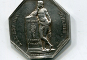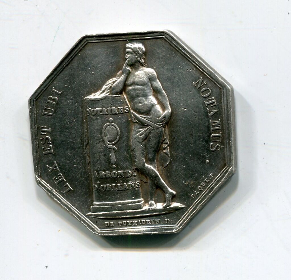 Revers : LEX EST UBI NOTAMUS, jeune homme nu, les reins drapés, accoudé sur un cippe portant miroir de la prudence placé entre "Notaires" et " Arrondt d'orléans". Également sur ce revers les signatures de Caqué et Puymaurin. - jeton octogonal 30 mm, 14,55 grammes.