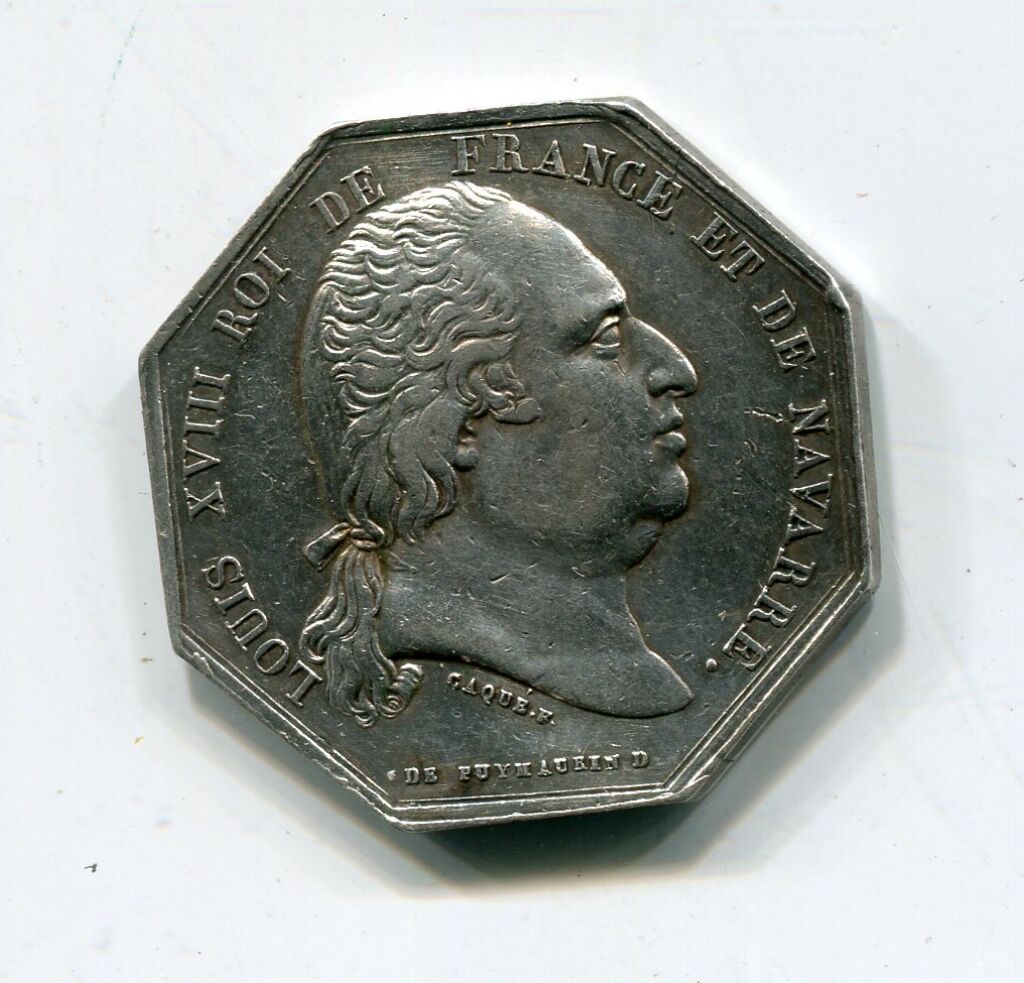 ARGENT - NOTAIRES D'ORLEANS - LOUIS XVIII ROI de FRANCE et de NAVARRE, buste nu profil à droite. Sous le cou signatures de Caqué et Puymaurin.