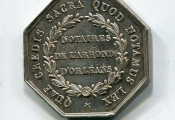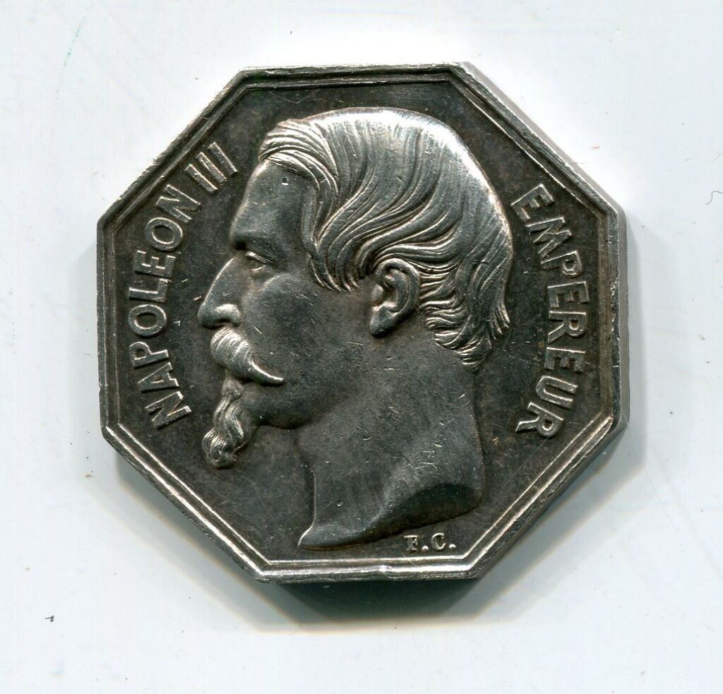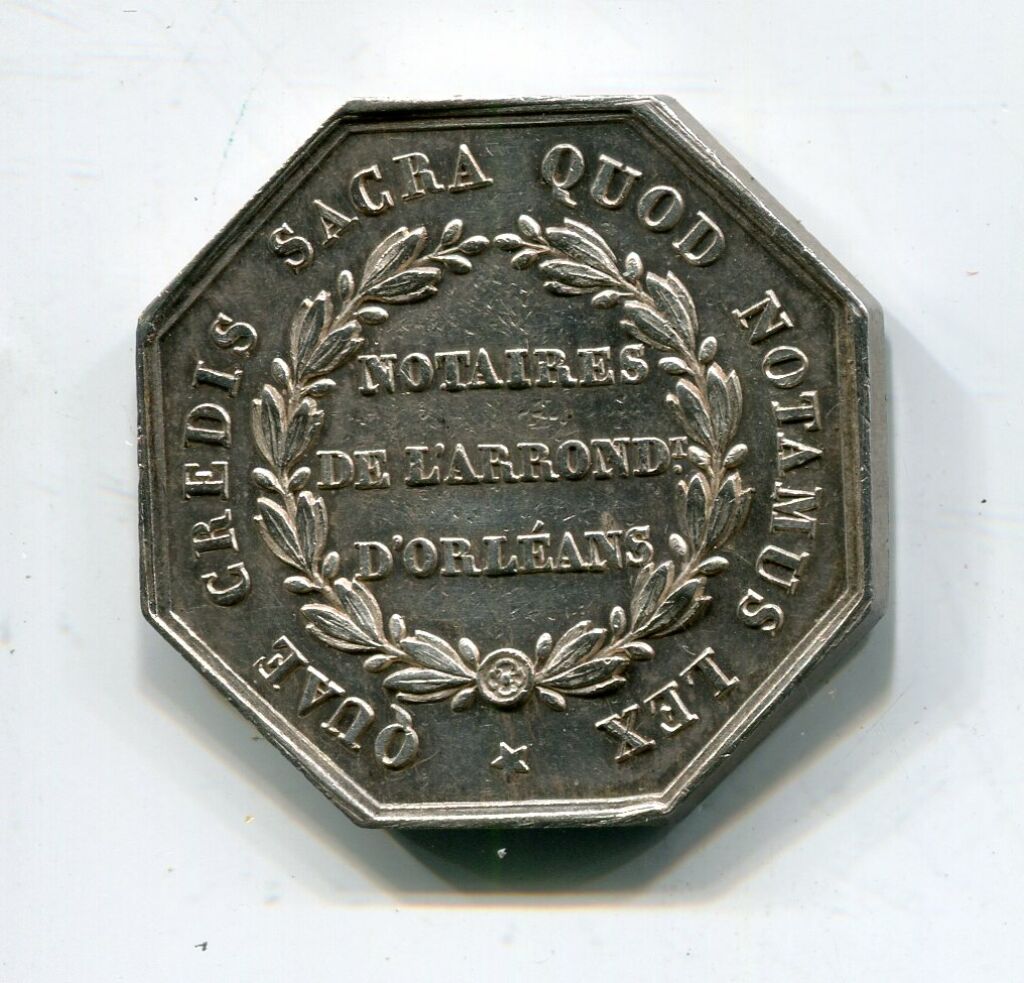 ARGENT - NOTAIRES D'ORLEANS - ". NAPOLEON III EMPEREUR " - buste TETE NUE profil à gauche, signé F.C. sous le cou - Revers : " QUAE CREDIS, SACRA QUOD NOTAMUS LEX ", titre dans une couronne de laurier reliée à la base par une fleur à 4 pétales. - sur la tranche poinçons argent et main indicatrice - jeton octogonal 30,5 mm -