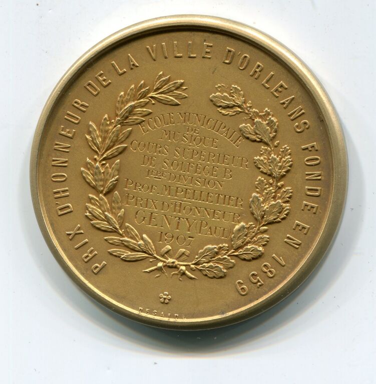 Revers : "prix d'honneur de la ville d'orléans fondé en 1859" ; en centre entre 2 palmes : École municipale de musique, cours supérieur de solfège B, 1ère division, Prof M. Pelletier, Prix d'honneur GENTY Paul 1907 " - sur la tranche poinçons argent et sanglier.