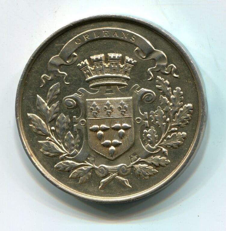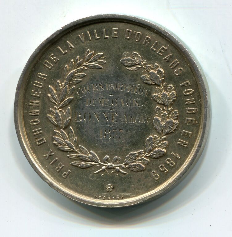 Revers : "prix d'honneur de la ville d'orléans fondé en 1859" ; en centre entre 2 palmes : Cours d'Orphéon, Dt=r M Gack, BONNE Amédée 1877 " -