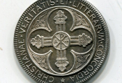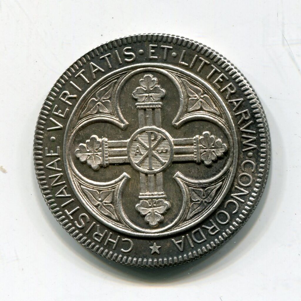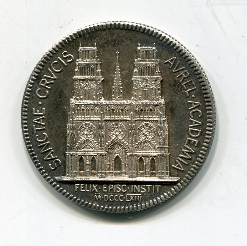 ARGENT - ORLEANS "ACADEMIE SAINTE CROIX" - SANCTAE CRVCIS AVREL ACADEMIA . En centre cathédrale Sainte Croix d'orléans vue de face ; à l'exergue FELIX EPIS INSTIT M.DCC.LXIII (1863) - - Revers : CHRISTIANAE VERITATIS ET LITTERARVM CONCORDIA, quadrilobe, croix aux bras terminés par une feuille d'acanthe, au centre monogramme XP cantonné d'A et W - tranche cannelée, poinçon argent et poinçon corne.