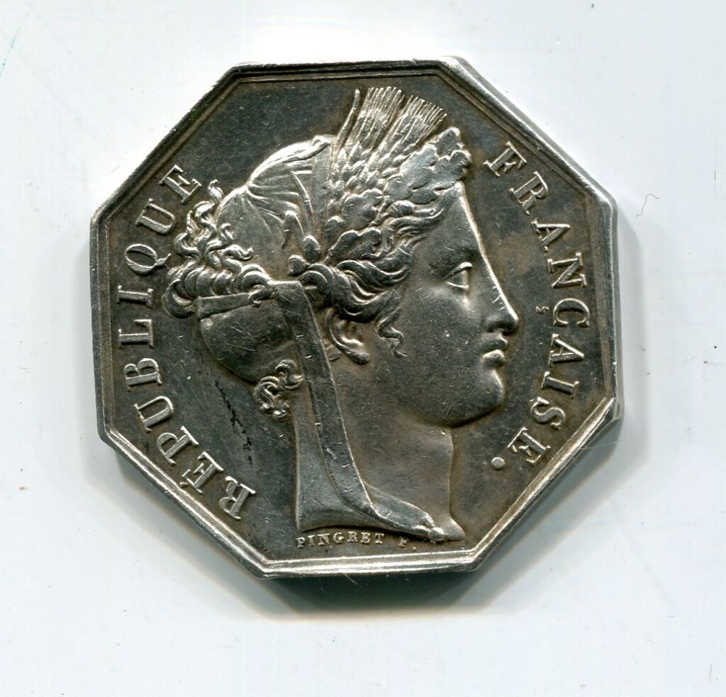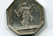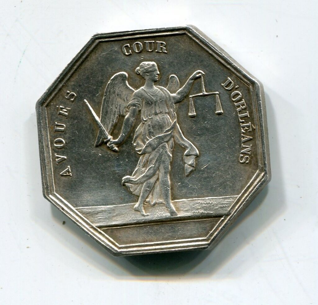 ARGENT - ORLEANS - HOMMES de LOIS - 3e République - "REPUBLIQUE FRANCAISE", tête de République laurée d'épis de blé, longue tresse dans la chevelure, profil à droite, signée PINGRET - Revers : nouveau revers , AVOUES COUR D'ORLEANS, la justice ailée, les yeux bandés, debout vers la droite, une balance dans la main gauche, un glaive dans la droite - sur la tranche poinçons argent et main indicatrice - Octogonal 30,5 mm.