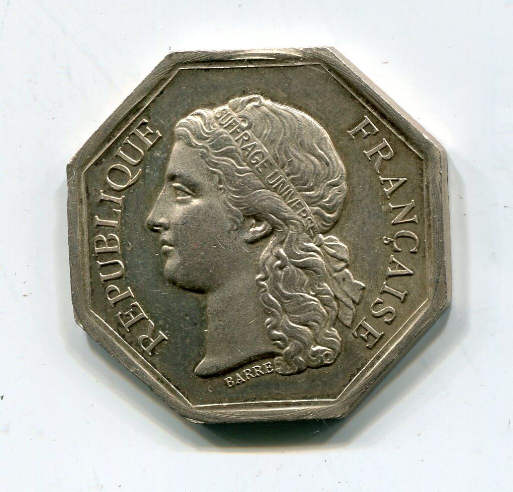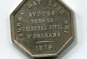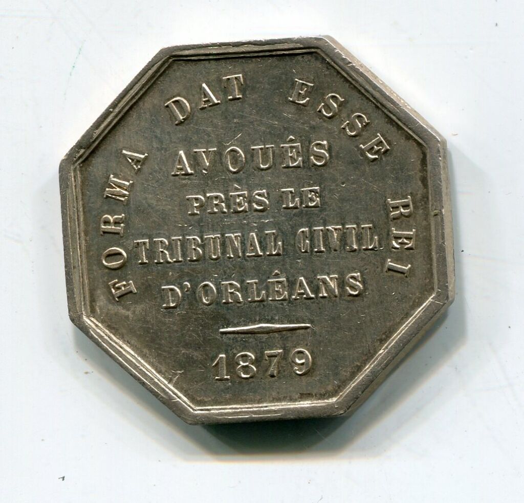 ARGENT - ORLEANS - HOMMES de LOIS - 3e République - "REPUBLIQUE FRANCAISE", tête de République, profil à gauche, avec bandeau dans les cheveux inscrit " Suffrage universel ", signée BARRE - Au revers :"Forma Dat Esse Rei", AVOUES PRES LE TRIBUNAL CIVIL D'ORLEANS 1879 - sur la tranche poinçon argent 1er titre (950 millièmes) et corne - jeton octogonal 31 mm - 15,57 grammes - L/A n° 1504 - TTB