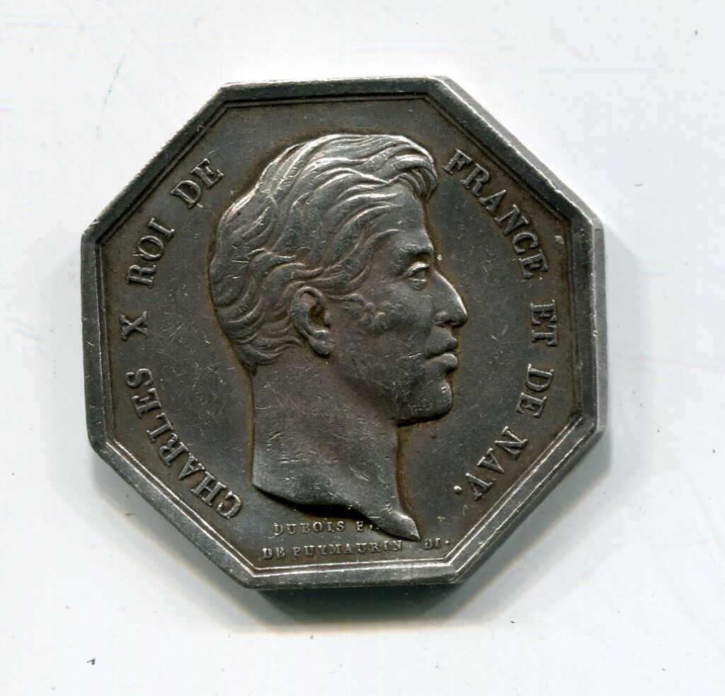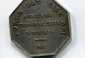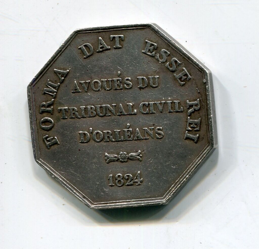 ARGENT - ORLEANS - HOMMES de LOIS - CHARLES X, ROI de FRANCE et DE NAV, buste profil à droite, sous le cou double signatures DUBOIS et DE PUYMAURIN (2e signature décalée à gauche - Revers : en légende circulaire "Forma Dat Esse Rai" - en centre AVOUES DU TRIBUNAL CIVIL D'ORLEANS 1824 petit séparateur entre tribunal et date.- octogonal 30 mm - 13,26 grammes - L/A n° 1481 - TTB