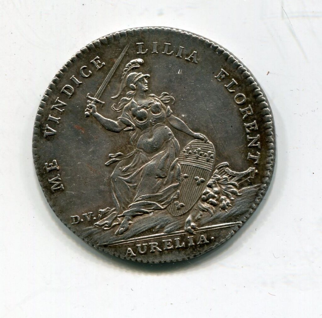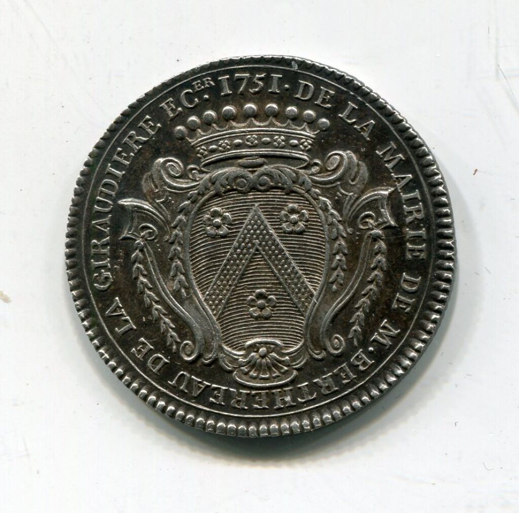 ARGENT - ORLEANS - JETON de MAIRE - " DE LA MAIRIE DE M. BERTHEREAU DE LA GIRAUDIERE ECer 1751 ses armes couronnées - Revers : ME VINDICE LILIA FLORENT en légende circulaire. AURELLIA à l'exergue - En centre la Pucelle assise de face tenant épée de la main droite, la gauche appuyée sur le blason d'Orléans - Signé D.V. à gauche - tranche et listel cannelés.
