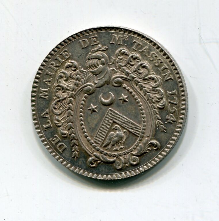 ARGENT - ORLEANS - JETON de MAIRE - " DE LA MAIRIE DE M. TASSIN 1754, ses armes surmontées d'un heaume - Revers : ME VINDICE LILIA FLORENT en légende circulaire. AURELLIA à l'exergue - En centre la Pucelle assise de face tenant épée de la main droite, la gauche appuyée sur le blason d'Orléans - Signé D.V. à gauche -