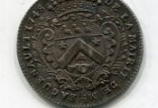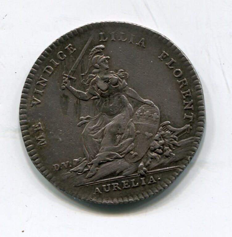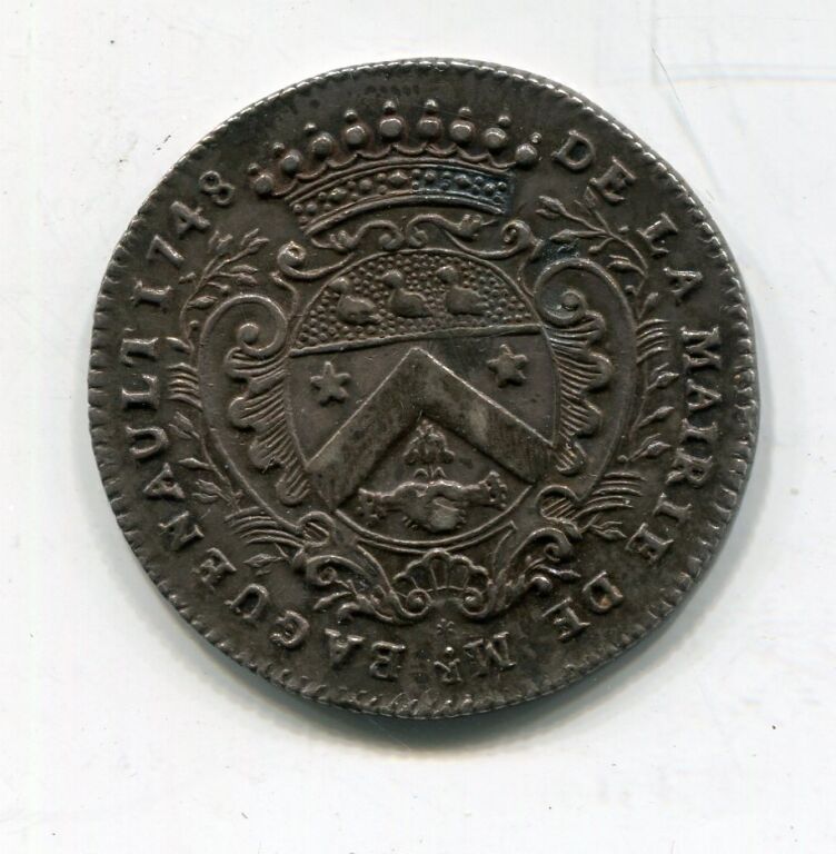 ARGENT - ORLEANS - JETON de MAIRE - " DE LA MAIRIE DE Mr BAGUENAULT 1748", ses armes couronnées - Revers : ME VINDICE LILIA FLORENT en légende circulaire. AURELLIA à l'exergue - En centre la Pucelle assise de face tenant épée de la main droite, la gauche appuyée sur le blason d'Orléans - Signé D.V. à gauche - tranche et listel cannelés.