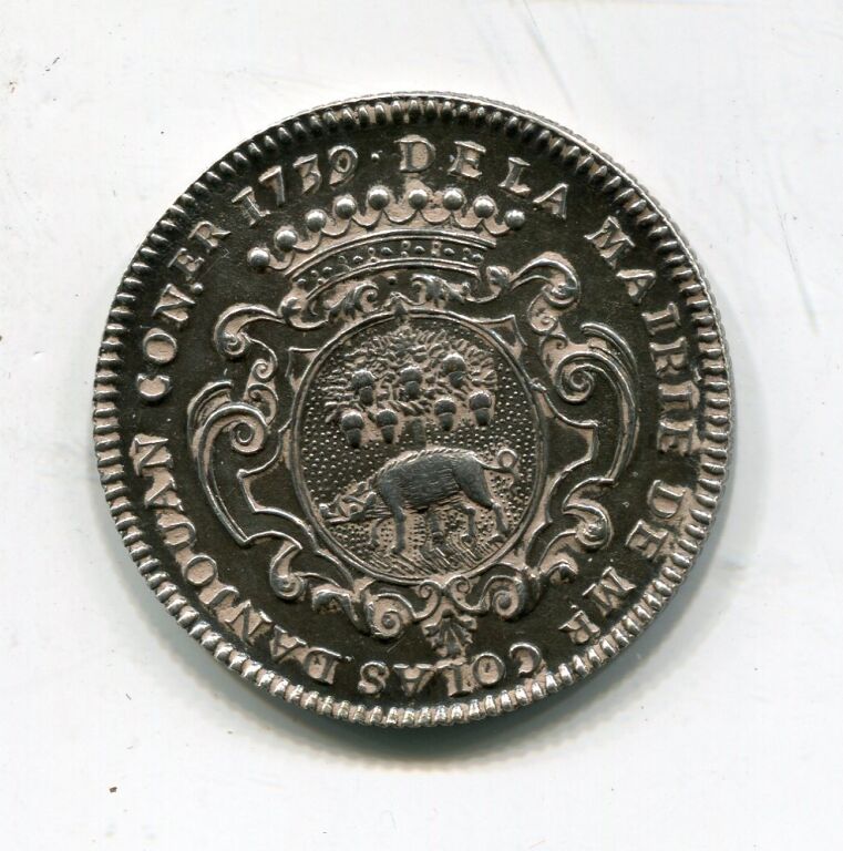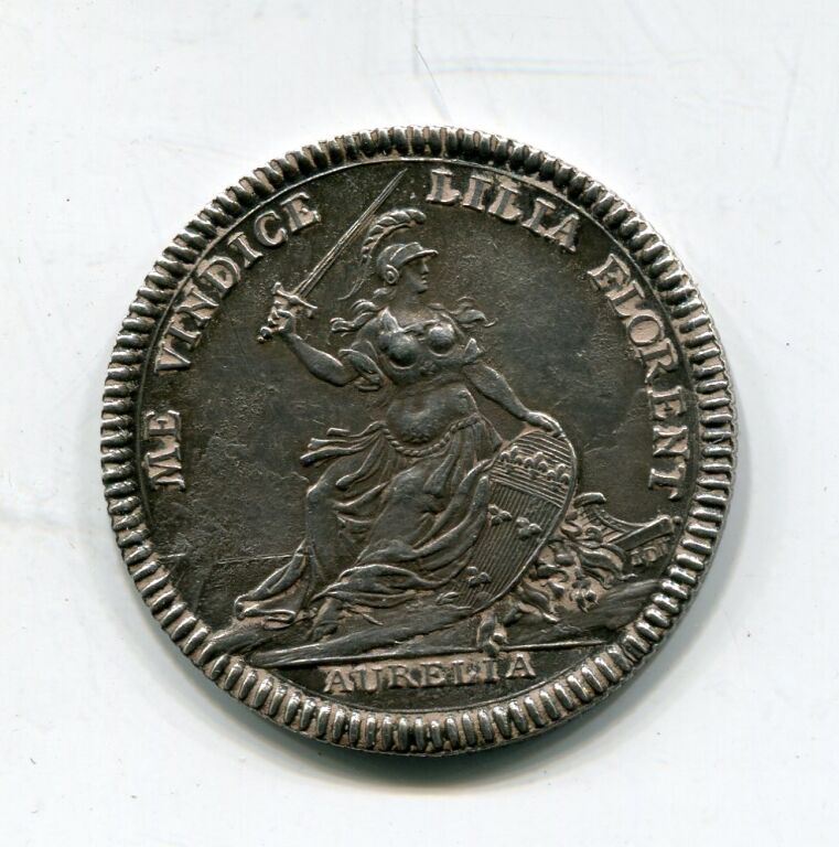 ARGENT - ORLEANS - JETON de MAIRE - " DE LA MAIRIE DE Mr COLAS DANJOUAN CONer 1739" ,dans le champ ses armes couronnées - Revers : ME VINDICE LILIA FLORENT en légende circulaire, AURELLIA à l'exergue. En centre la Pucelle assise de face tenant épée de la main droite, la gauche appuyée sur le blason d'Orléans -signé IDV à droite.