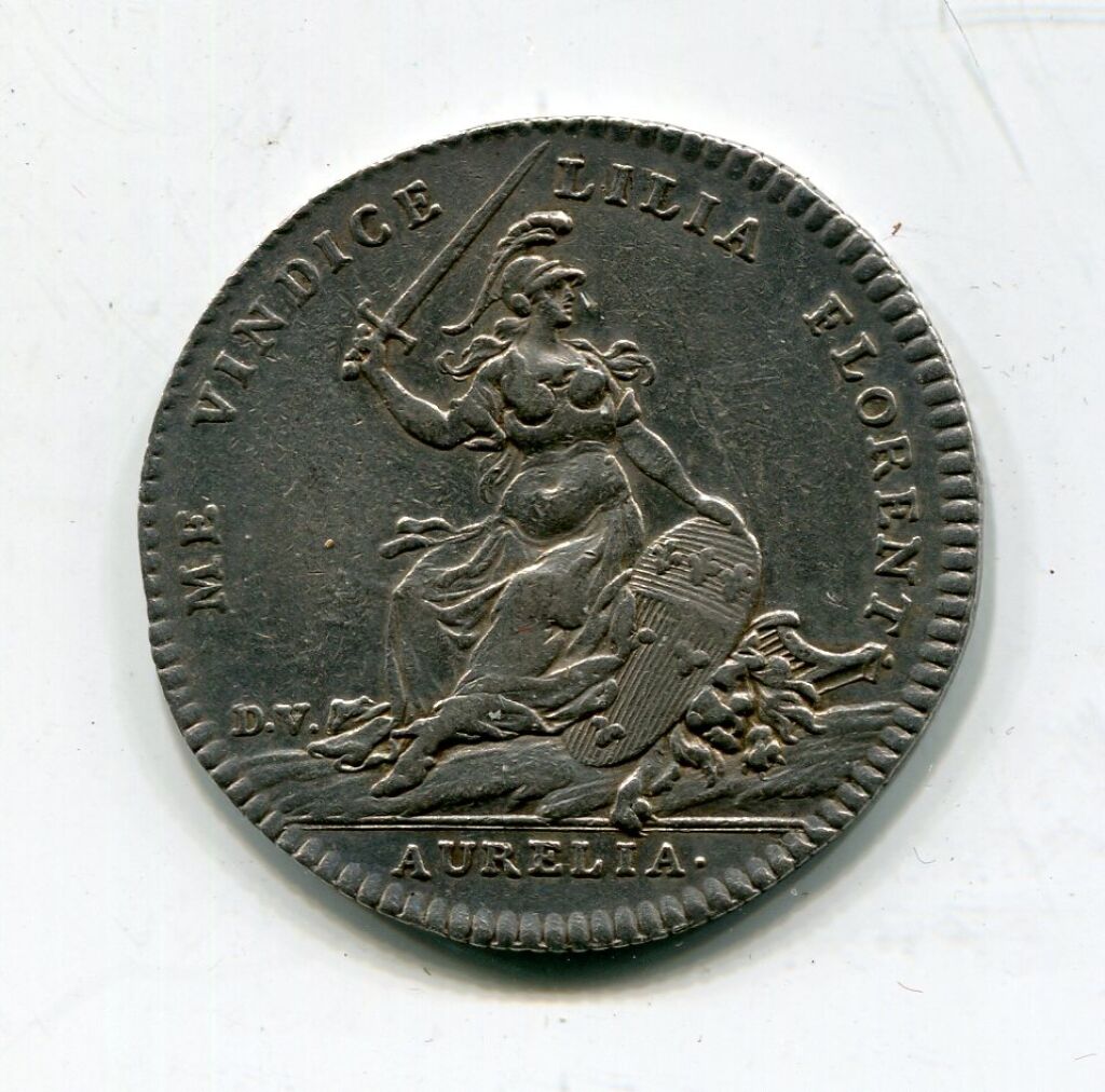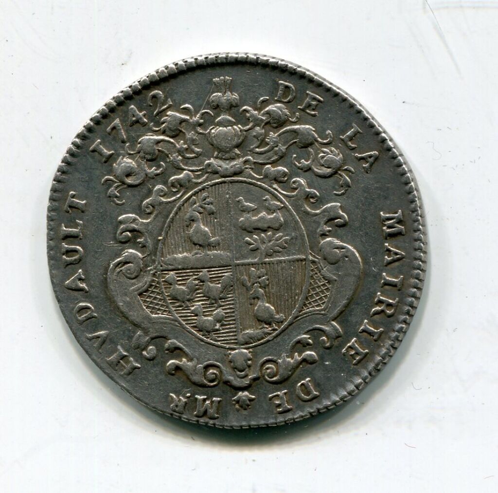 ARGENT - ORLEANS - JETON de MAIRE - " DE LA MAIRIE DE Mr HVDAULT 1742 " -ses armes surmontées d'un heaume - Revers : ME VINDICE LILIA FLORENT en légende circulaire. AURELLIA à l'exergue - En centre la Pucelle assise de face tenant épée de la main droite, la gauche appuyée sur le blason d'Orléans - signé D.V. à gauche. - frappe monnaie - 31 mm - tranche et listel cannelés - 9,68 grammes -