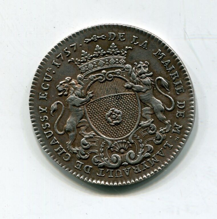 ARGENT - ORLEANS - JETON de MAIRE - " DE LA MAIRIE DE Mr LAMYRAULT DE CHAUSSY ECUr 1757, ses armes couronnées - Revers : ME VINDICE LILIA FLORENT en légende circulaire. AURELLIA à l'exergue - En centre la Pucelle assise de face tenant épée de la main droite, la gauche appuyée sur le blason d'Orléans - Signé ID.V. à droite -