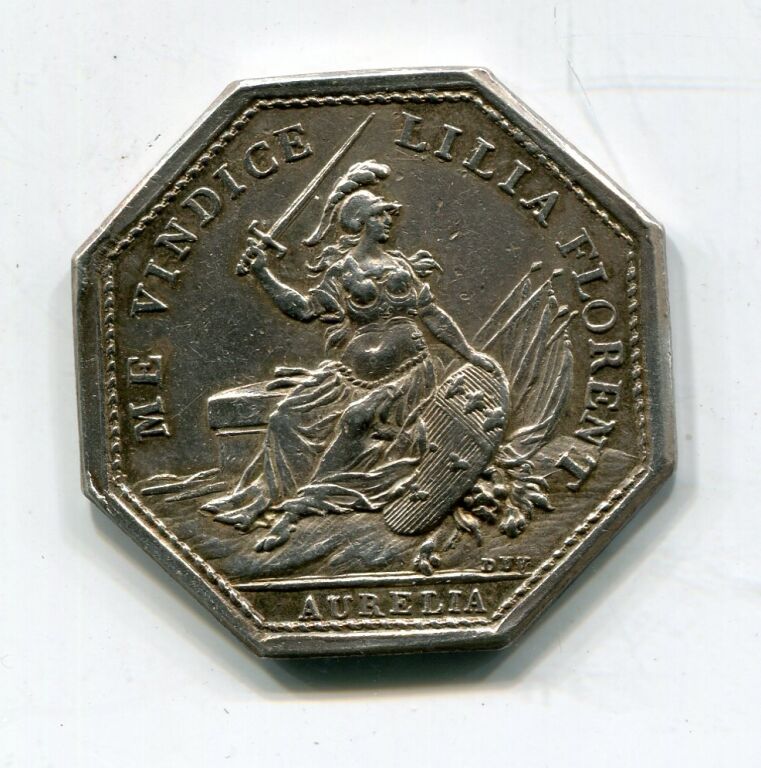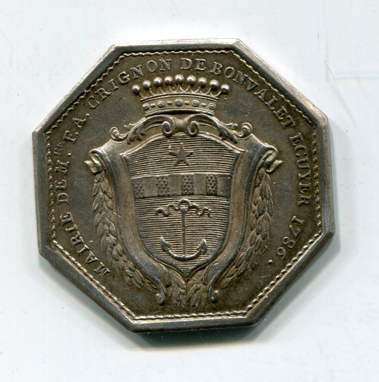 ARGENT - ORLEANS - JETON de MAIRE - " MAIRIE DE Mre F.A. CRIGNON DE BONVALET ECUYER 1786", ses armes couronnées entourées de 2 palmes - Revers : ME VINDICE LILIA FLORENT en légende circulaire. AURELLIA à l'exergue - En centre la Pucelle assise de face, cordelette autour de la taille, tenant épée de la main droite, la gauche appuyée sur le blason d'Orléans, faisceau de drapeau à l'arrière ( 4 hampes )