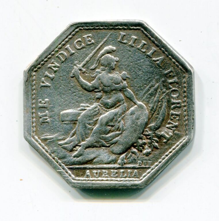 ARGENT - ORLEANS - JETON de MAIRE - " MAIRIE DE Mre F.A. CRIGNON DE BONVALET ECUYER 1786", ses armes couronnées entourées de 2 palmes - Revers : ME VINDICE LILIA FLORENT en légende circulaire. AURELLIA à l'exergue - En centre la Pucelle assise de face, cordelette autour de la taille, tenant épée de la main droite, la gauche appuyée sur le blason d'Orléans, faisceau de drapeau à l'arrière. (4 hampes)
