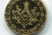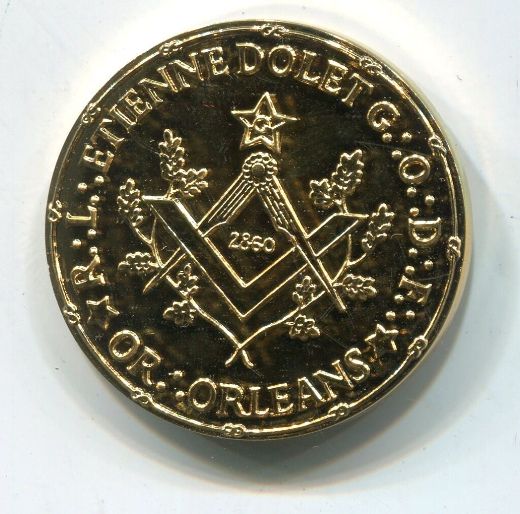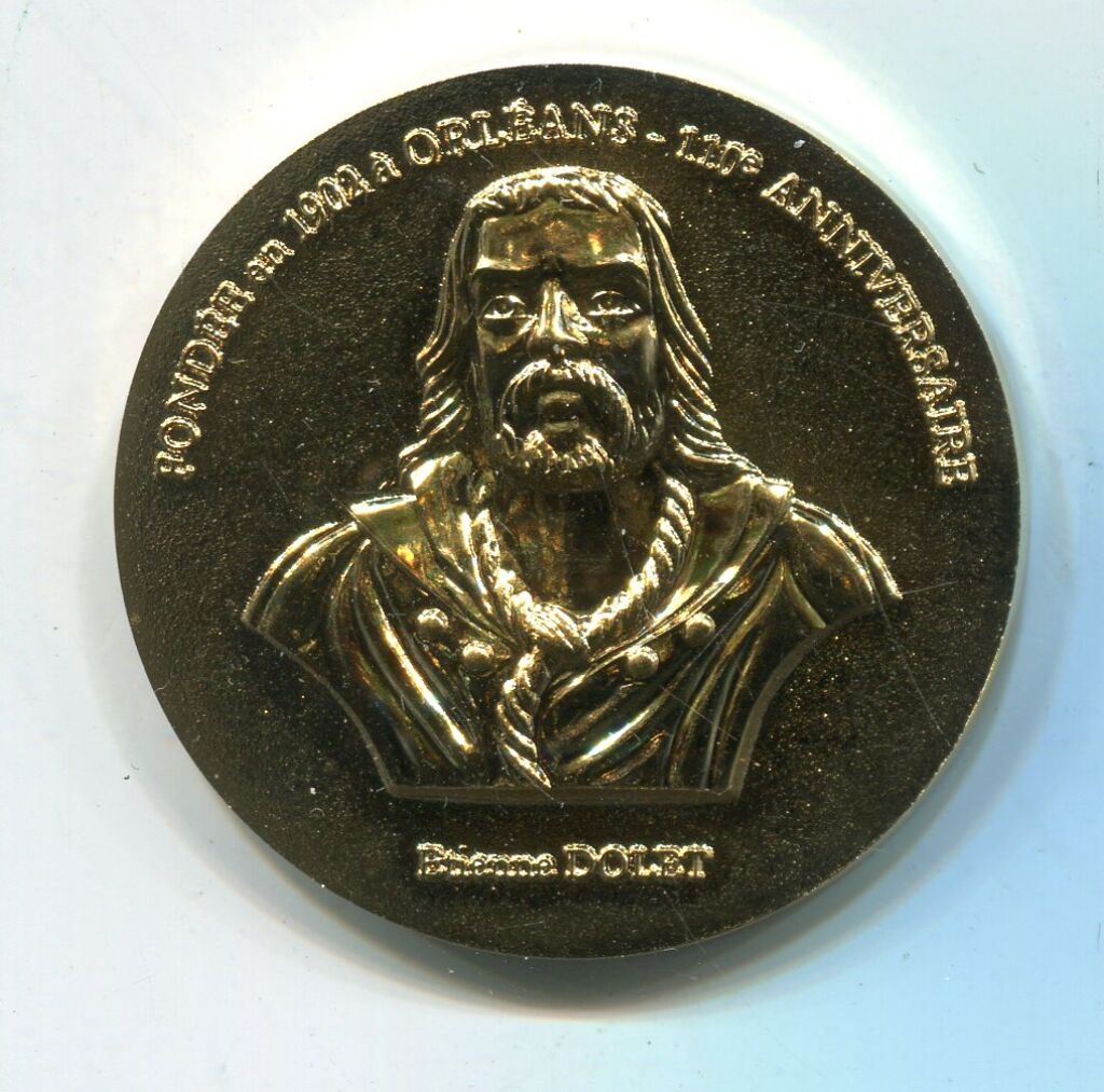 jeton commémoratif du 110e anniversaire de la loge au portrait en relief de face d' ETIENNE DOLET. - Revers, légende circulaire : "OR (3points) ORLEANS * R.L. (3 points) ETIENNE DOLET G (3 points) O (3 points) D (3 points) F (3 points) * ; en centre sous une étoile à 5 branches : compas et équerre entourés de 2 rameaux de chêne, au centre date 2860.