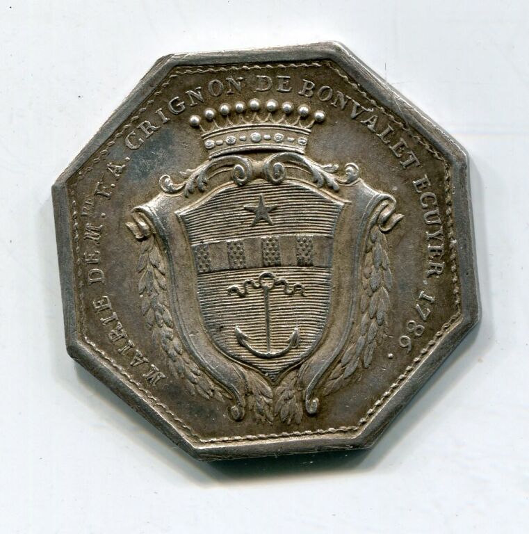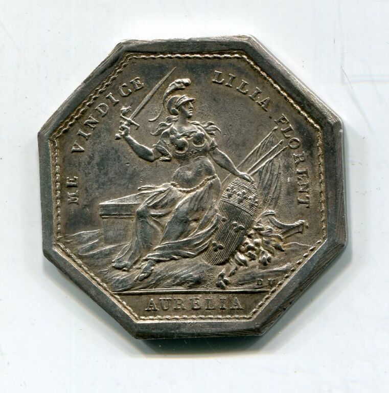 ARGENT - ORLEANS - TRES RARE JETON de MAIRE - " MAIRIE DE Mre F.A. CRIGNON DE BONVALET ECUYER 1786", ses armes couronnées entourées de 2 palmes - Revers : ME VINDICE LILIA FLORENT en légende circulaire. AURELLIA à l'exergue - En centre la Pucelle assise de face, cordelette autour de la taille, tenant épée de la main droite, la gauche appuyée sur le blason d'Orléans, faisceau de drapeau à l'arrière -