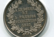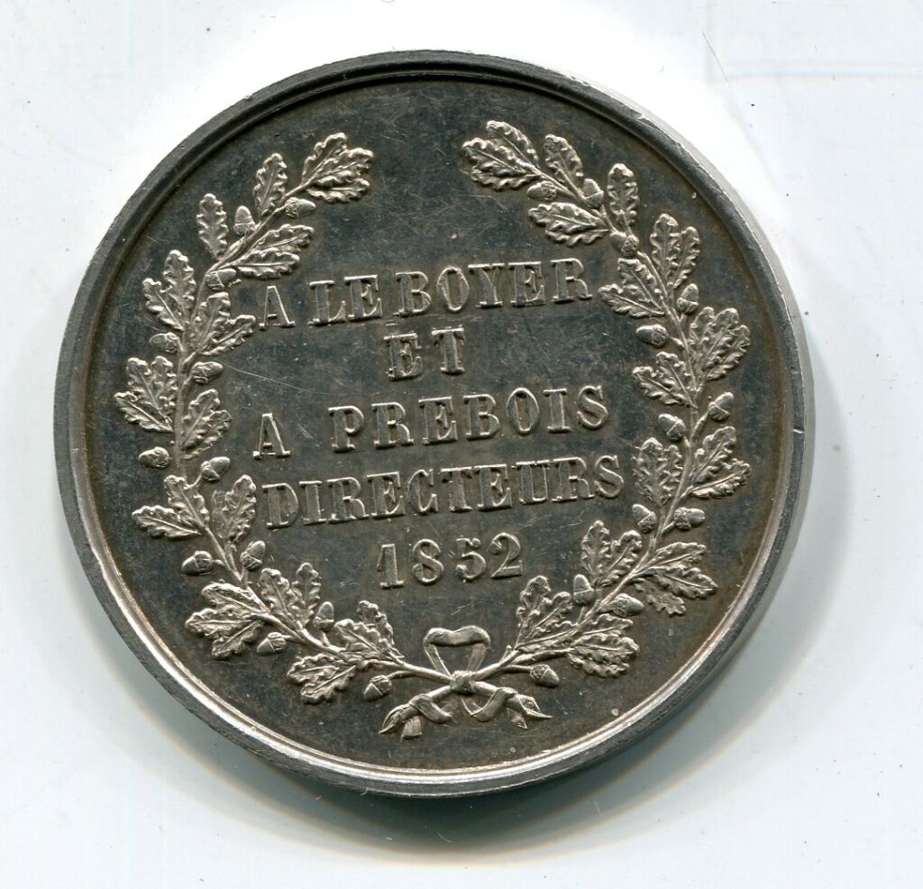 Navire à vapeur à aubes, voiles sorties, voguant sur les vagues - au revers, entre 2 palmes de feuilles de chêne et glands : A LE BOYER et A PREBOIS DIRECTEURS 1852 ".