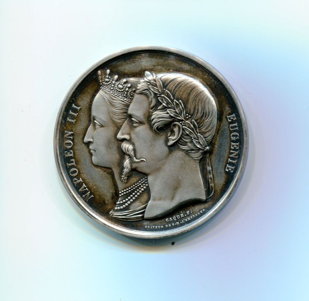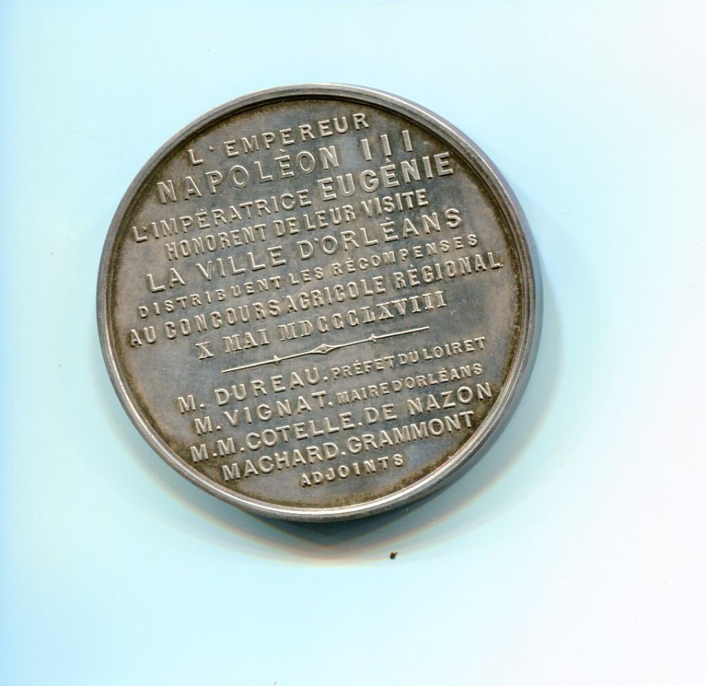 ARGENT - RARISSIME MEDAILLE de VISITE 2e EMPIRE, COUPLE IMPERIAL 1868 à ORLEANS - Bustes accolés de l'impératrice Eugénie portant diadème et l'Empereur Napoléon III tête laurée - Très inhabituelle œuvre du sculpteur CAQUE F. "graveur de S.M. L'Empereur " - Revers, texte 13 lignes : "L'Empereur Napoléon III, l'impératrice Eugenie honorent de leur visite la ville d'Orléans, distribuent les récompenses au concours agricole régional X mai MDCCC LXVIII / M. Dureau préfet du Loiret - VIGNAT Maire d'orléans -COTELLE de NAZON, MACHARD, GRAMMONT adjoints ".