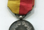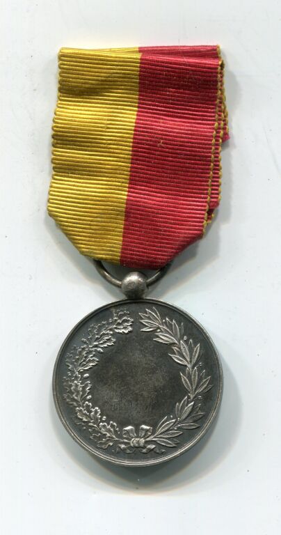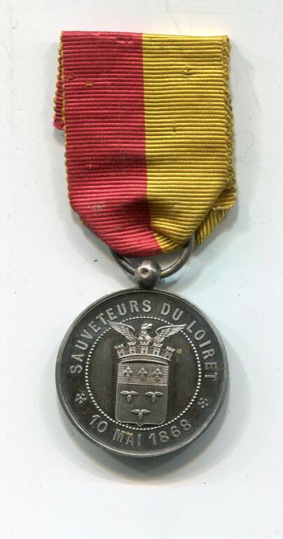 ARGENT - " SAUVETEUR du LOIRET 10 MAI 1868 " - Médaille avec ruban (décoration) 2e Empire, Blason d'orléans couronné surmonté d'un aigle ailes déployées - Revers pour attribution entre 2 palmes de feuilles de chêne et olivier - 27,5 mm - Ruban 2 bandes partition rouge / jaune - argent poinçon sanglier sur la boule de bélière -