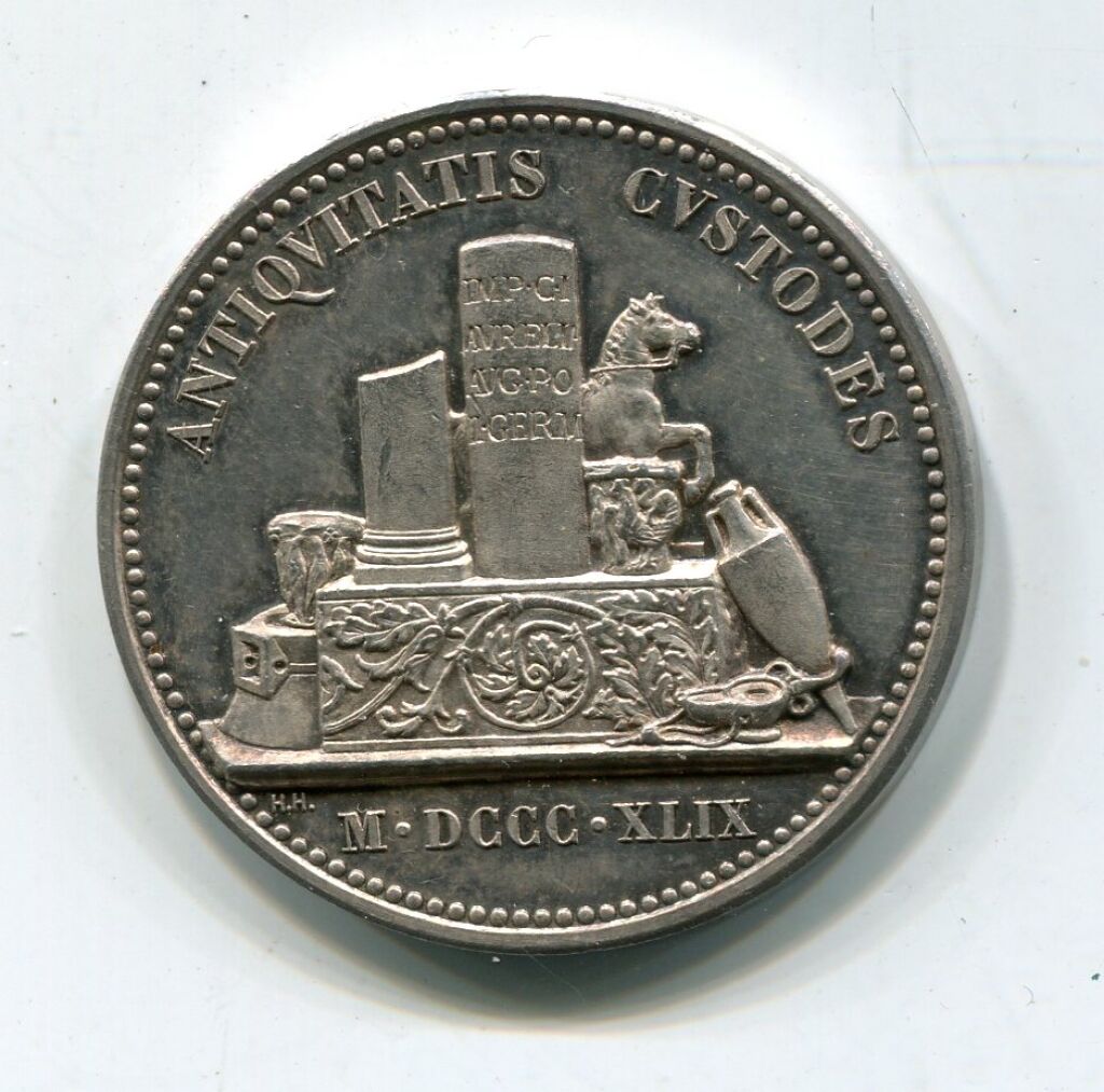 ANTIQVITATIS CVSTODES MDCCC XLIX (1849), - signé H.H. à gauche de la date - deux colonnes antiques une amphore accolée et l'avant d'un cheval..- au revers texte dans une couronne de laurier.- sur la tranche mention argent et poinçon corne - 31 mm -