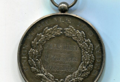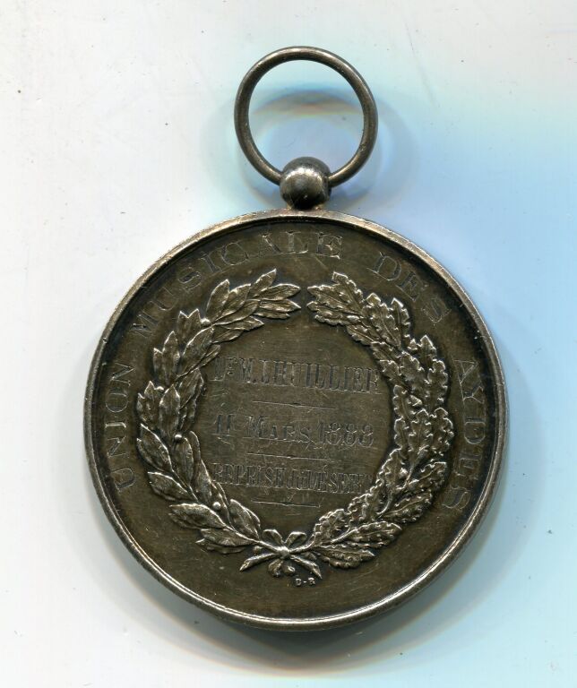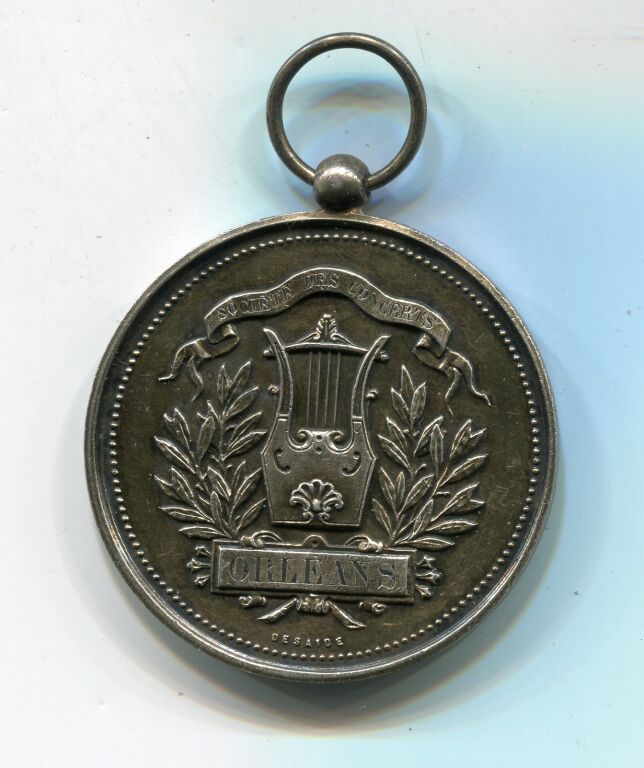 ARGENT - SOCIETE des CONCERTS ORLEANS -médaille avec bélière - Lyre à 4 cordes entourée de 2 palmes de feuilles d'olivier - Revers : UNION MUSICALE DES AYDES en légende circulaire ; en centre entre 2 palmes de feuilles de chêne et laurier attribution : Dr M. LHUILLIER 11 mars 1888 "reprise du désert" - 41 mm - 36,18 grammes.
