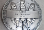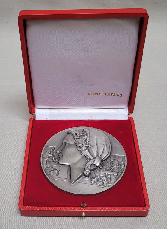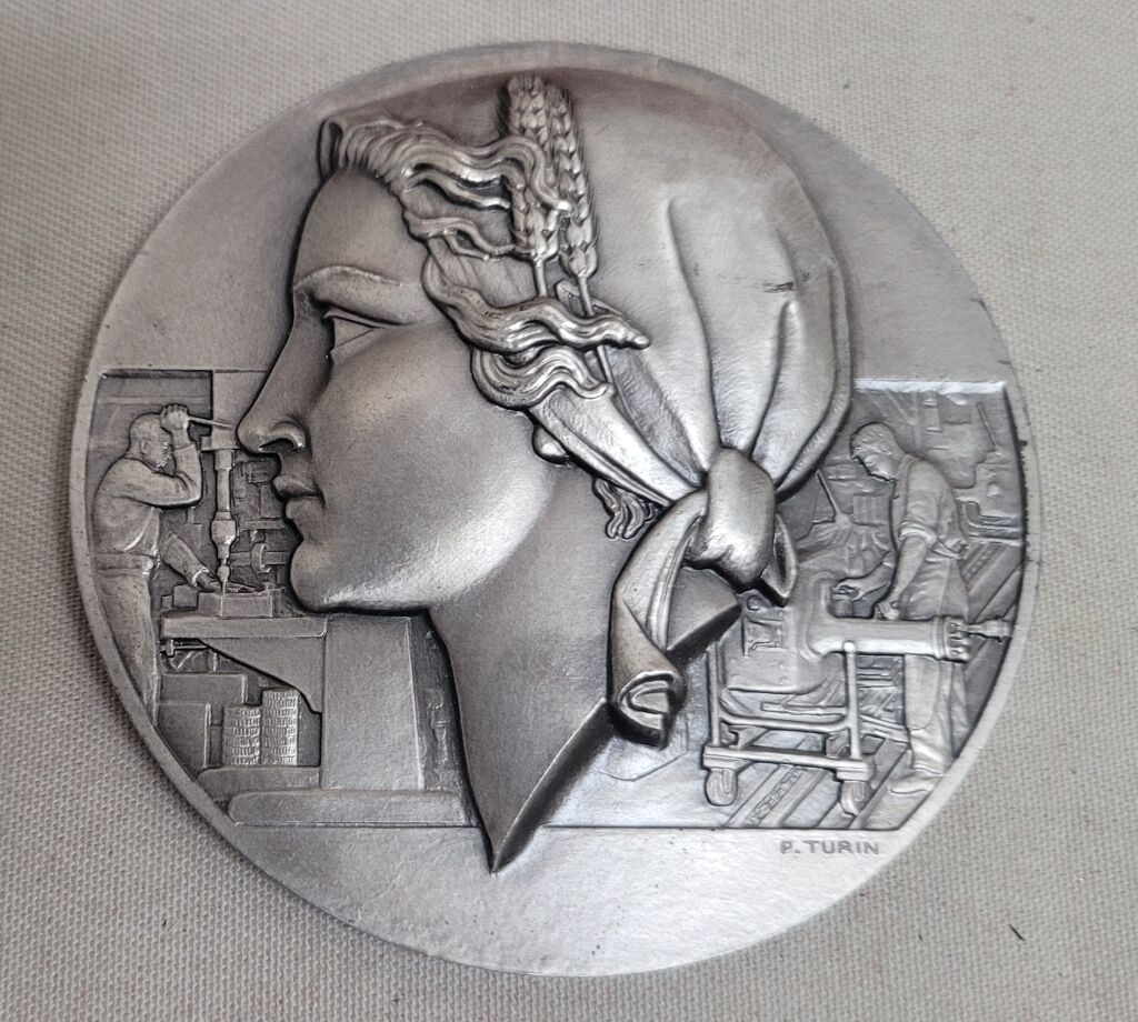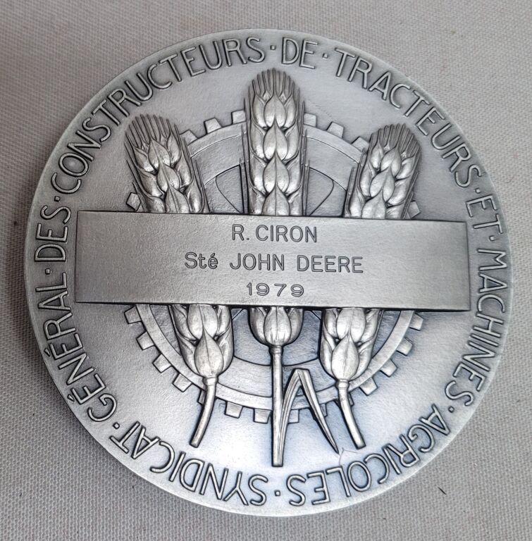 Tête de République, haut relief en centre, coiffée avec un bonnet orné de 2 épis de blé, profil à gauche. Au 2e plan de scènes d'atelier de mécanique - OEuvre due au talent du graveur de la monnaie Pierre TURIN (1891-1968 / Prix de ome 1920 ). - Revers : titre en pourtour, en centre 3 épis de blé sur roue dentée - cartouche en centre pour attribution : " R. CIRON Société JOHN DEERE 1979 " - sur la tranche poinçons argent 1er titre et corne 1979.