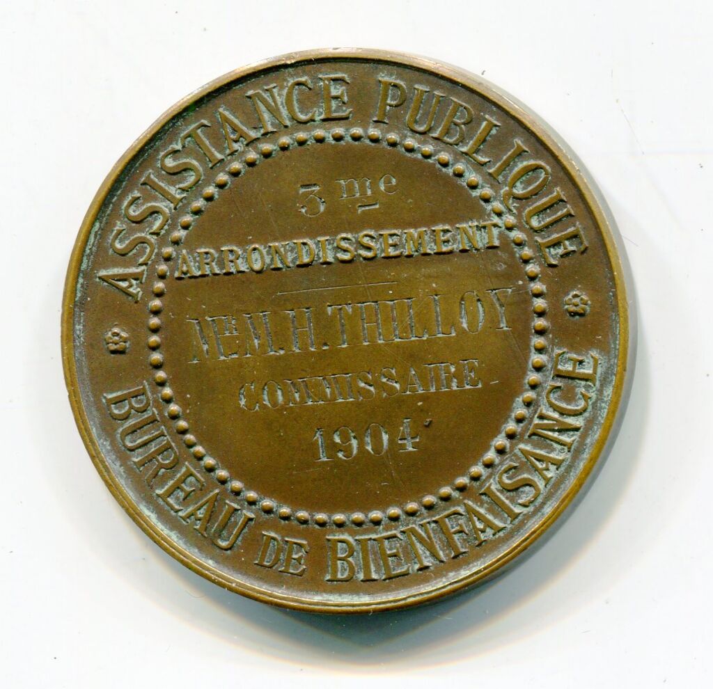 " ASSISTANCE PUBLIQUE de Paris / BUREAU de BIENFAISANCE - 3e arrondissement, BUREAU de BIENFAISANCE " - à l'avers " République Française - Liberté-Egalite-Fraternité", en centre blason couronné de la ville de Paris entre 2 palmes de chêne et laurier. Desaïde ed. - attribution par gravure : " Mr M.H. THILLOY COMMISSAIRE 1904 ".