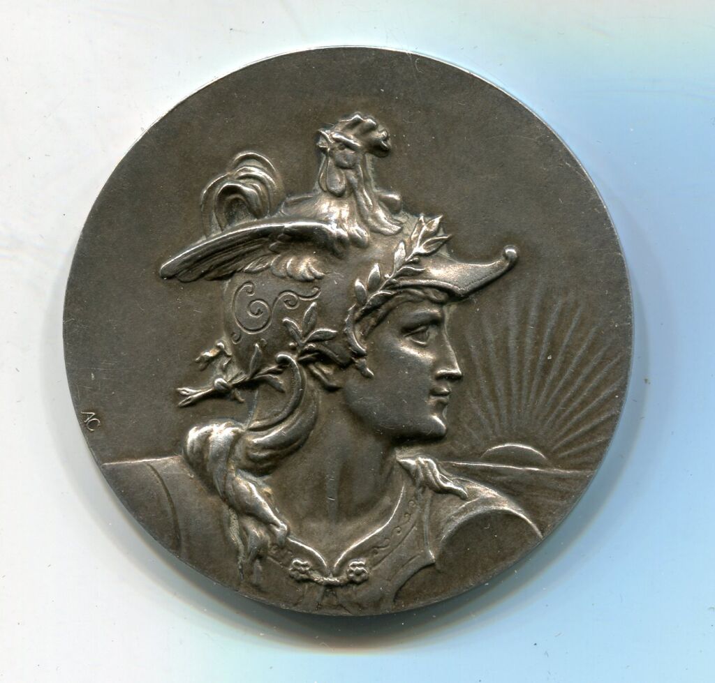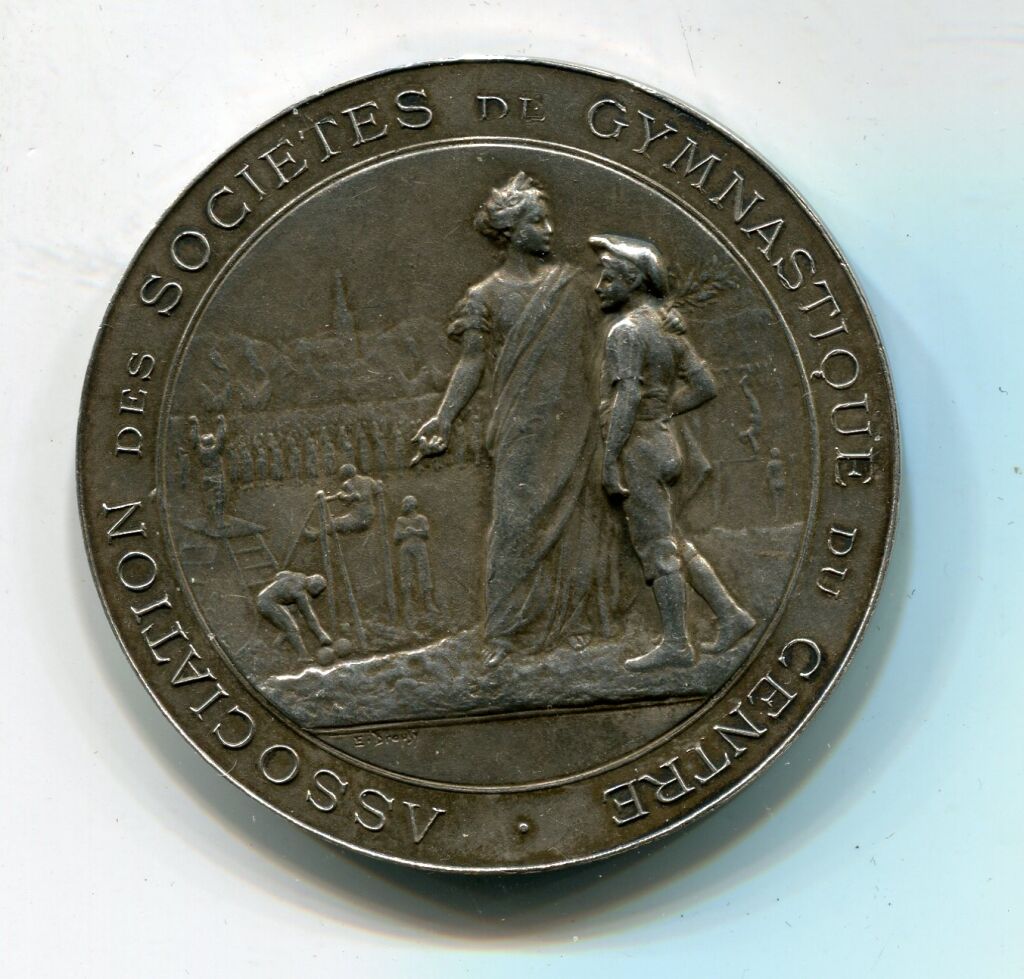 " ASSOCIATION des SOCIETES de GYMNASTIQUE du CENTRE " - médaille d'honneur classe argent 46 mm, bronze argenté 39,80 grammes, poinçon Arthus Bertrand. Circa 1910/20 - .Tête de république, haut relief profil à droite, coiffée du casque corinthien surmonté du coq. - Au revers : scènes de concours de gymnastique signée Dropsy. Au 1er plan une femme en toge pose la main sur un jeune concurrent.