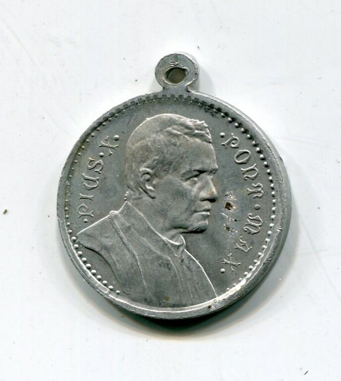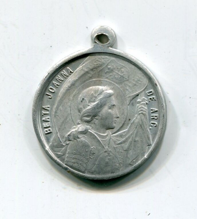 BEATIFICATION de JEANNE D'ARC " - Médaillette de propagande pour la béatification et de protection pour les soldats de 1914 ( * ) - BEATA JOANNA DE ARC, sous son étendard Jeanne tête nimbée, en cuirasse, de profil à droite - Revers : PIUS X PONT MAX portrait de PIE X, profil à droite. - Aluminium avec bélière 22 mm - 1,13 grammes - TTB