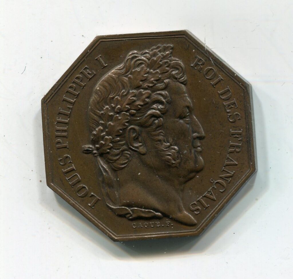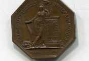 revers : Femme appuyée du coude gauche sur un coffre, la main gauche tenant une hampe surmontée d'un œil rayonnant et la main droite tenant une corne d'abondance d'où s'échappent des fruits - . Jeton octogonal en CUIVRE - 31 mm, 14,93 grammes.