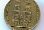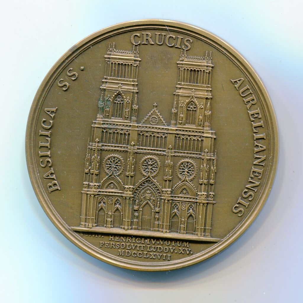 Buste haut relief du Roi, cuirassé, la tête lauré - OEuvre signée B. DUVIVIER. Revers : " BASILICA SS. CRUSIS AURELLIANENSIS fine gravure signée B. DUVIV (Benjamin Duvivier) de la cathédrale aux deux tours à deux étages, de face.