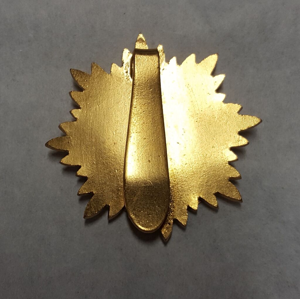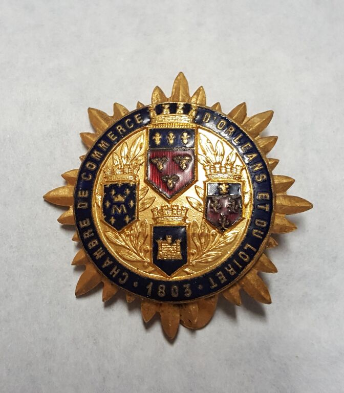 " CHAMBRE de COMMERCE D'ORLEANS et du LOIRET 1803 " - INSIGNE de FONCTION, attache clip veston - 3é république - Email grand feu rond 41 mm, blasons d'orléans et villes du Loiret sur soleil, couronne bleue, posé sur un soleil - L/A n° 262 - SUP