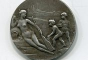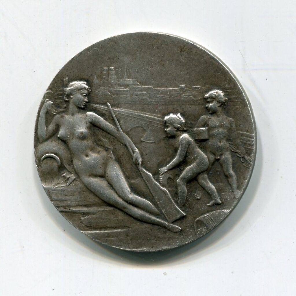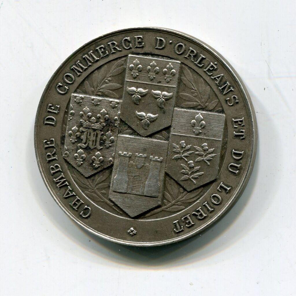 " CHAMBRE de COMMERCE D'ORLEANS et du LOIRET. 3e république type modifié. - bronze argenté. - Femme nue allongée symbolisant La Loire, coude droit sur une urne déversant, la main gauche tenant un gouvernail ; à droite 2 enfants nus lui présente roue dentée et coffre. Au fond vue sur la ville d'orléans et pont royal. OEuvre signée A. Lanson .- Revers : titre en pourtour, en centre, sur rameaux d'olivier, armes des 4 grandes villes du Loiret - Sur la tranche poinçons bronze et corne. - poids léger.