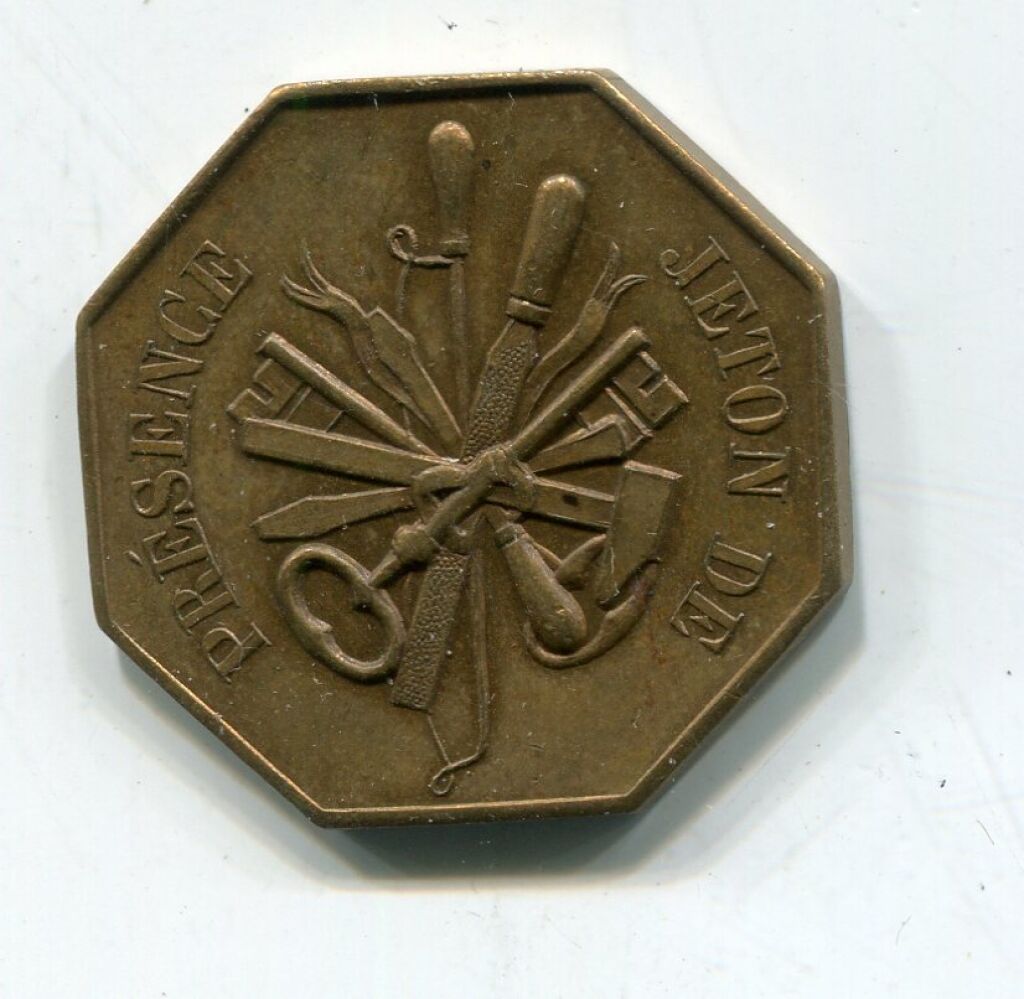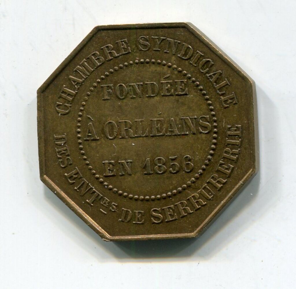" CHAMBRE SYNDICALE des ENTREPRENEURS de SERRURERIE FONDEE à ORLEANS EN 1856 " - JETON de PRESENCE, instruments professionnels, clef posée au dessus - Texte au revers.