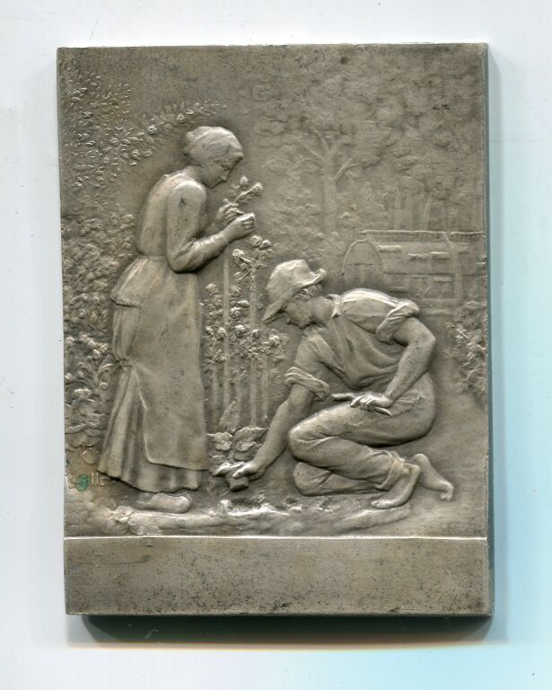 Sur fond d'arbres et de serres, une femme debout et un homme accroupi, soignent un rosier. Au revers : sous une grande palme de laurier " OFFERT PAR LA Cie P.O. MIDI ".