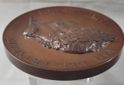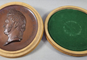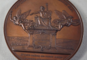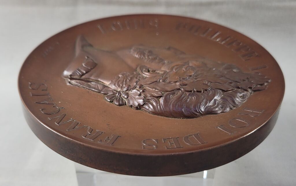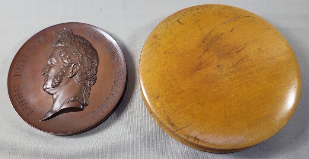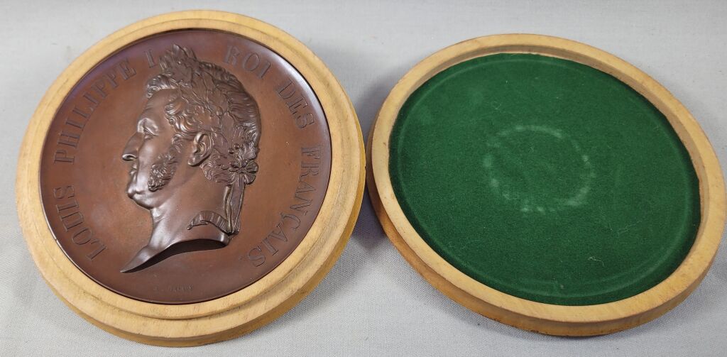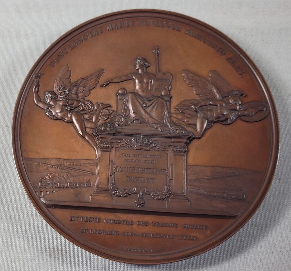 en centre : groupe allégorique comprenant l'État trônant, tenant de sa main gauche des tables marquées sur 3 lignes "CHEMIN DE FER", indiquant de sa droite la route à Mercure s'envolant, tandis que à gauche un guerrier d'envole portant épée et bouclier. Sur le socle au plateau reposant sur 2 colonnes, dans un cartouche sous une couronne royale, en 4 lignes : LOI DU XI JUIN M.D.CCC.XLII / LOUIS PHILIPPE REGNANT. En second plan trains partant en étoile dans la campagne. - dans son coffret d'origine en bois de citronnier à la forme.