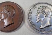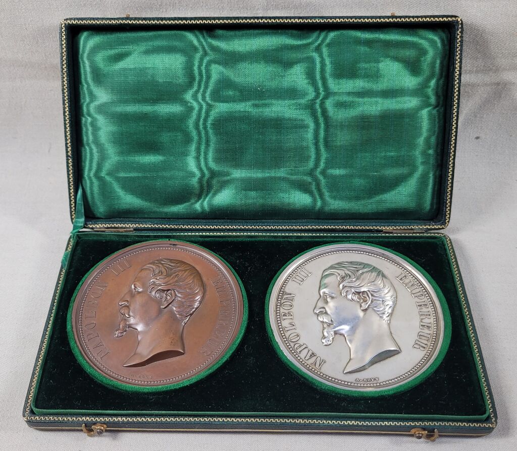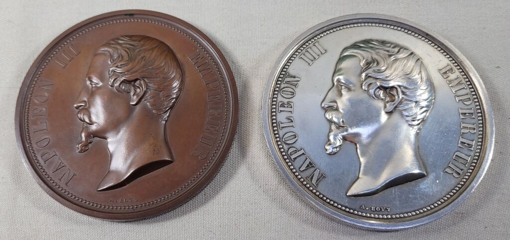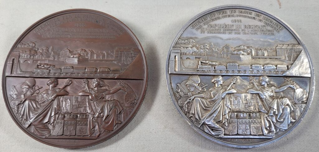 1°) - MEDAILLE en ARGENT - 77 mm - NAPOLEON III EMPEREUR. Très haut relief flan patiné brillant, tête nue profil à gauche. OEuvre du sculpteur A. BOVY. Revers dû au talent d'OUDINE : coupant le champ en 2 parties égales pont sur lequel passe un train de marchandises - En haut en 6 lignes : " Chemin de Fer de Paris en Espagne par Orléans, Tours, Bordeaux et Bayonne 1855, Napoléon III régnant. Mr P. Magne ministre de l'agriculture, du commerce et des travaux publics - En arrière-plan vue des Pyrénées et la ville de Bayonne. Partie en dessous : assises, allégories de la France et l'Espagne accoudées sur des écussons des 2 pays dont celui d'orléans à gauche, chacune cantonnée de symboles : sciences et arts, découverte de l'Amérique en 1492 et 3 peintres célèbres (Murillo, Vélasquez et Zurbaran) - poinçon argent et main indicatrice sur la tranche.