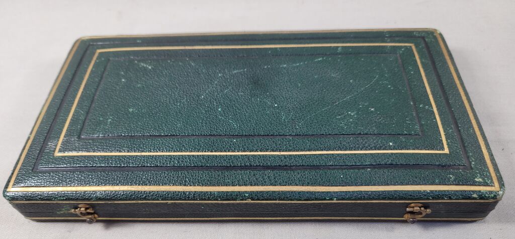 en leur beau coffret d'origine biplace, velours et satin vert, revêtement cuir vert filets or.