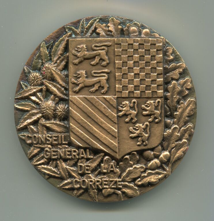CLERGOUX (19), médaille de table du CONSEIL GENERAL de la CORREZE.- Bronze poinçon corne, 80 mm - 402 grammes - Gravure haut relief du sculpteur haut viennois " G R ", blason de Corrèze posé sur glands & feuilles de chêne / bleuets - Revers : vue cavalière haut relief du château de SEDIERES - SUP
