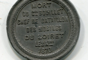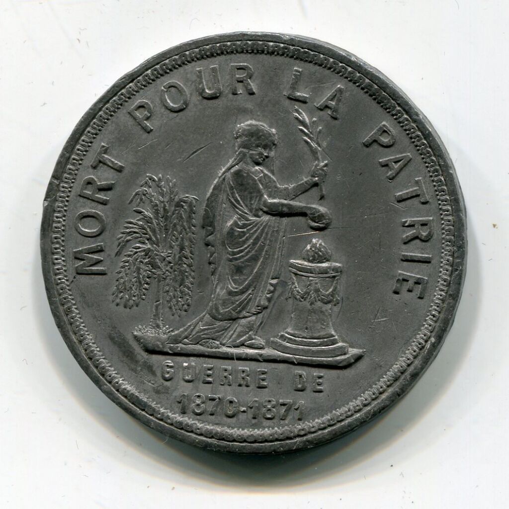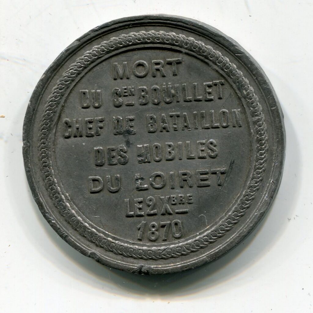 En centre femme debout, vêtue à l'antique, tenant une palme et sacrifiant sur un autel ; à gauche saule pleureur - Revers : "MORT du Gen BOUILLET, CHEF de BATAILLON des MOBILES du LOIRET LE 2 Xere (décembre) 1870 ". -