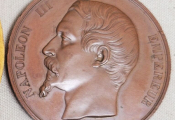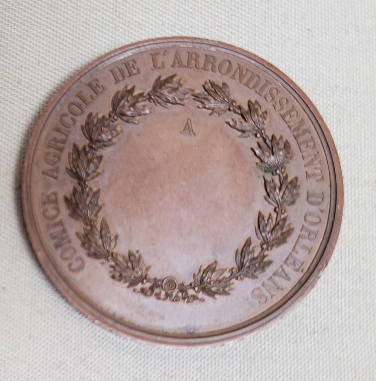 " COMICE AGRICOLE de L'ARRONDISSEMENT D' ORLEANS " grande médaille de récompense classe bronze en cuivre 50 mm - " NAPOLEON III EMPEREUR ", tête nue, haut relief, profil à gauche, signé BARRE. - Revers : titre et couronne de bouquets de feuilles de laurier, intérieur pour attribution. : " sur la tranche poinçons cuivre et abeille -