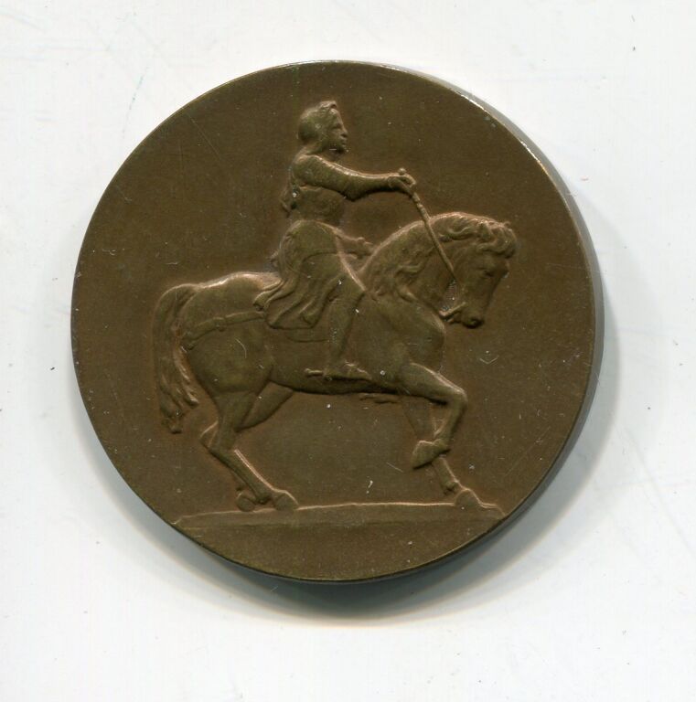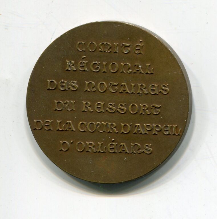 " COMITE REGIONAL des NOTAIRES du RESSORT de la COUR D'APPEL D'ORLEANS" - Statue équestre de Jeanne d'Arc de la place du Martroi, profil à droite. Texte au revers. Jeton rond 36 mm, sur la tranche poinçon BRONZE et marque fabricant J D dans un triangle - 21,53 grammes - L/A n° 1610 - TTB