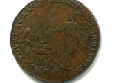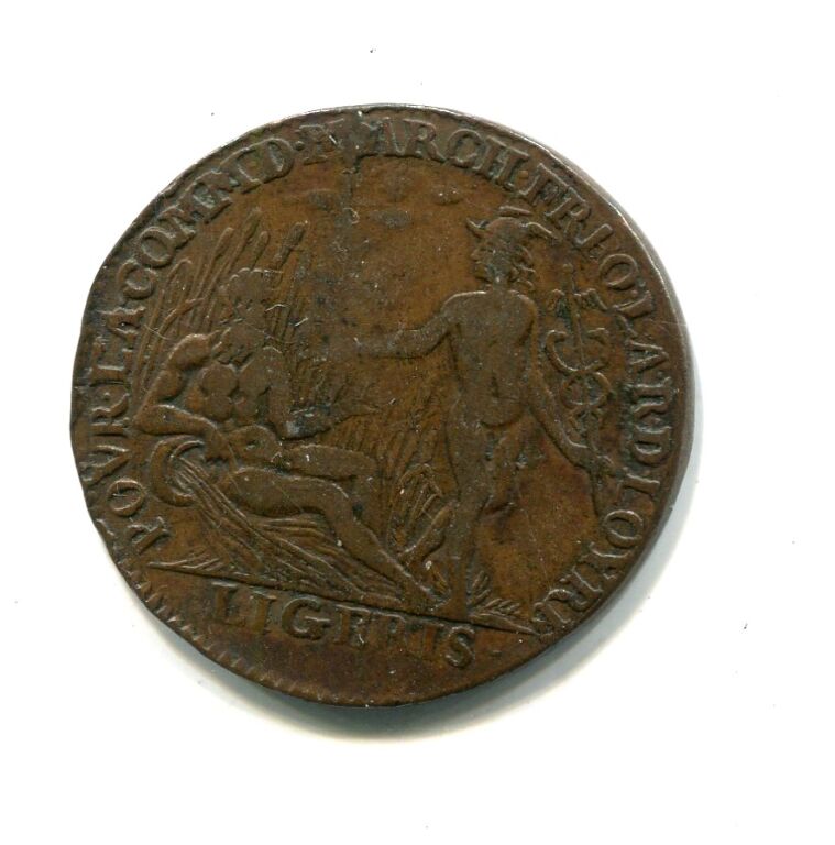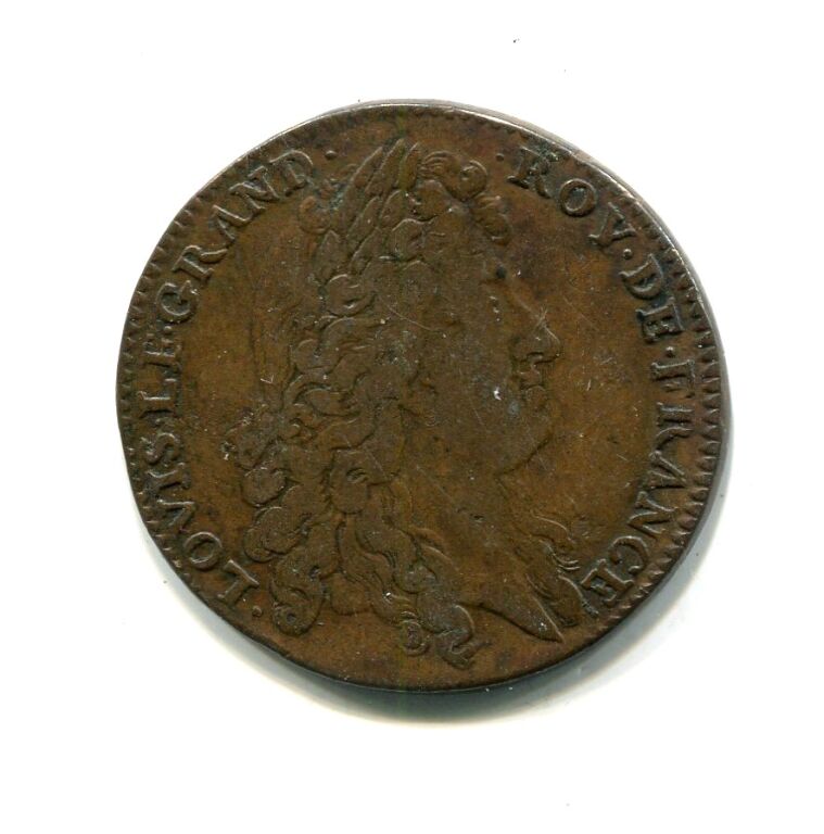 Jeton cuivre 27 mm. POVR. LA. COMM. D MARCH. FREQ. LA. R.D. LOYRE, allégorie du fleuve Loire assis dans les joncs, appuyé sur une urne et levant la main droite vers Mercure debout tenant caducée - Revers :LOVIS LE GRAND ROY DE FRANCE buste de Louis XIV à la grande perruque, profil à droite -