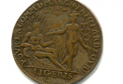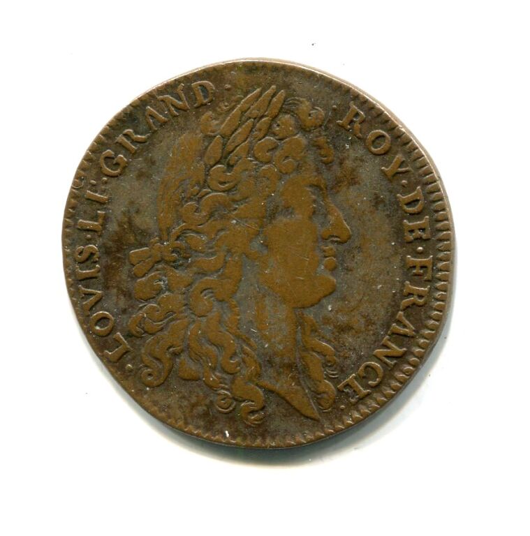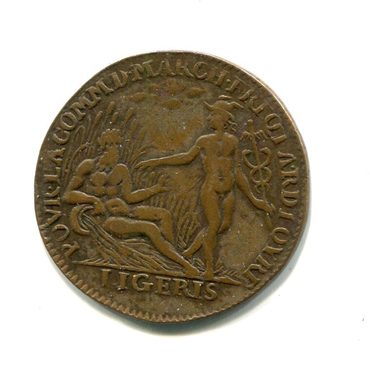 Jeton cuivre 27 mm. POVR. LA. COMM. D MARCH. FREQ. LA. R.D. LOYRE, allégorie du fleuve Loire assis dans les joncs, appuyé sur une urne et levant la main droite vers Mercure debout tenant caducée - Revers :LOVIS LE GRAND ROY DE FRANCE buste de Louis XIV à la grande perruque, profil à droite -