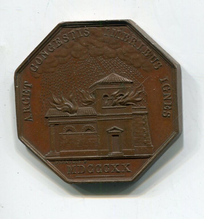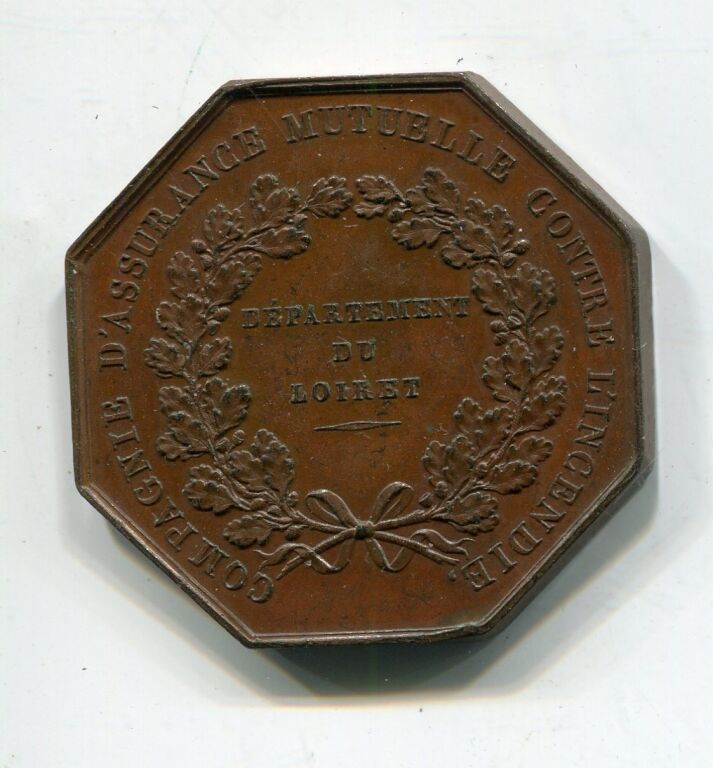 " COMPAGNIE D'ASSURANCE MUTUELLE CONTRE L'INCENDIE, DEPARTEMENT du LOIRET ", Titre en pourtour et à l'intérieur de deux palmes de feuilles de chêne - Revers : " ARCET CONGESTIS IMBRIBUS IGNES, bâtiment en feu, flammes s'échappant par les fenêtres et le toit, survolé par un épais nuage d'ou s'échappe la pluie.
