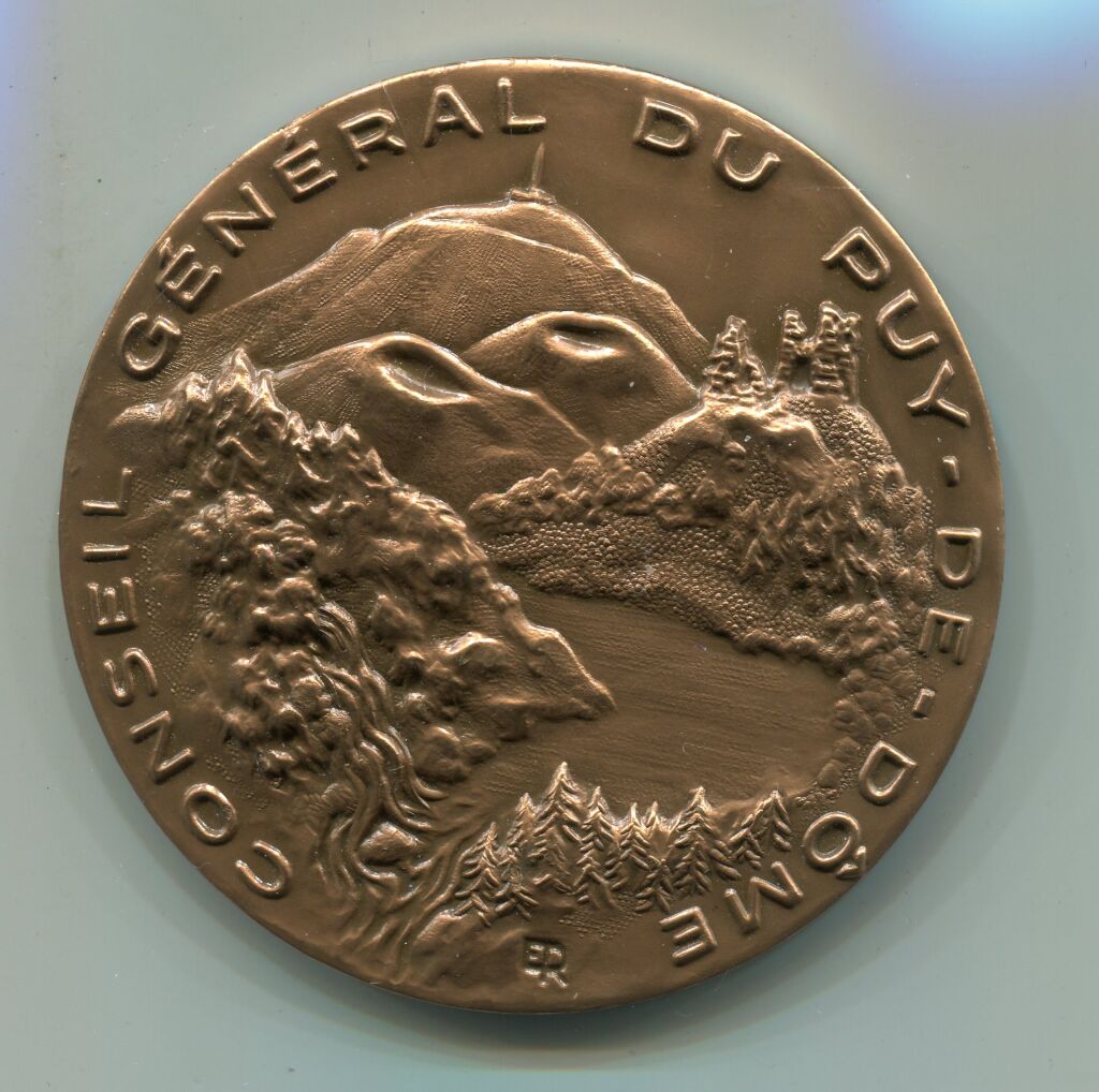 Vue des volcans, du Puy de Dôme et son relais hertzien, de vestiges historiques, lac. Revers : 5 blasons des principales villes du département - OEuvre d'Émile Rousseau. Sur la tranche poinçons bronze et corne & année frappe 1974. - 189,86 grammes- SUP
